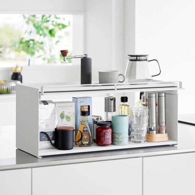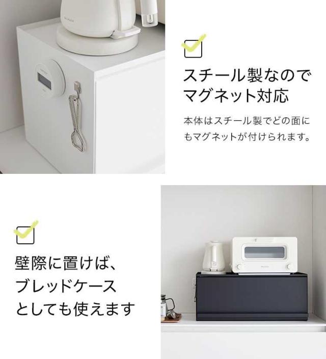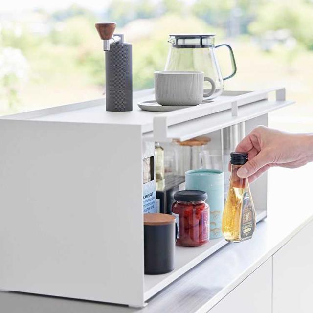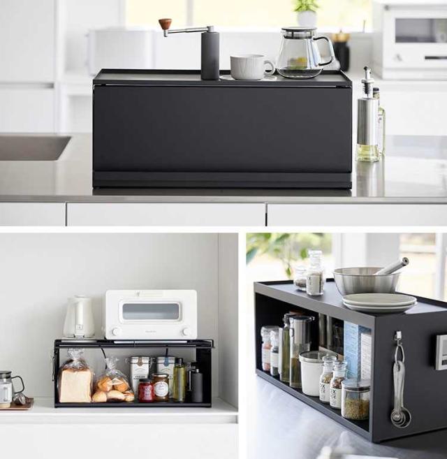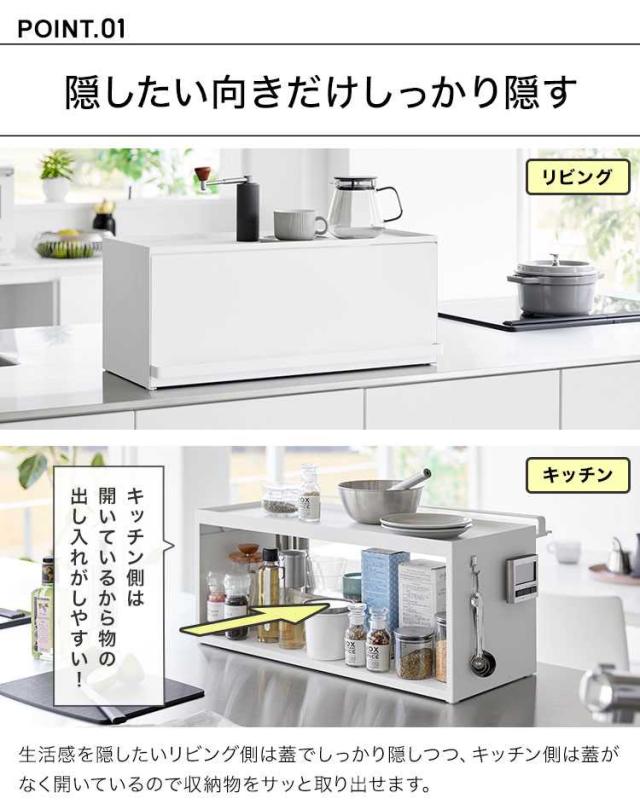 リビングからはスッキリ隠せて、キッチンからは使い勝手の良さが嬉しい。奥行き24cmのカウンター上収納ラックです。リビング側は全面が開くフラップ式の扉なので、中の物も取り出しやすいです。キッチン側は扉がないのでサッと物の出し入れがしやすいです。壁際に設置すればブレッドケースとしても使用でき、天板にはトースターを設置することができます。スチール製なのでマグネットが付き便利です。