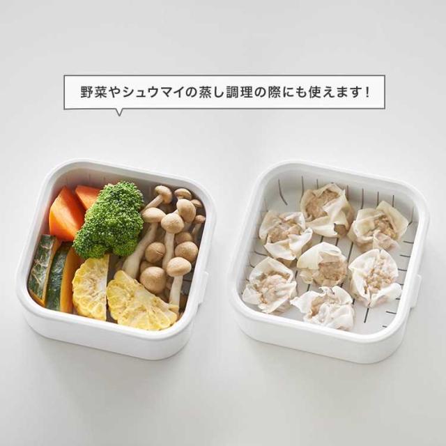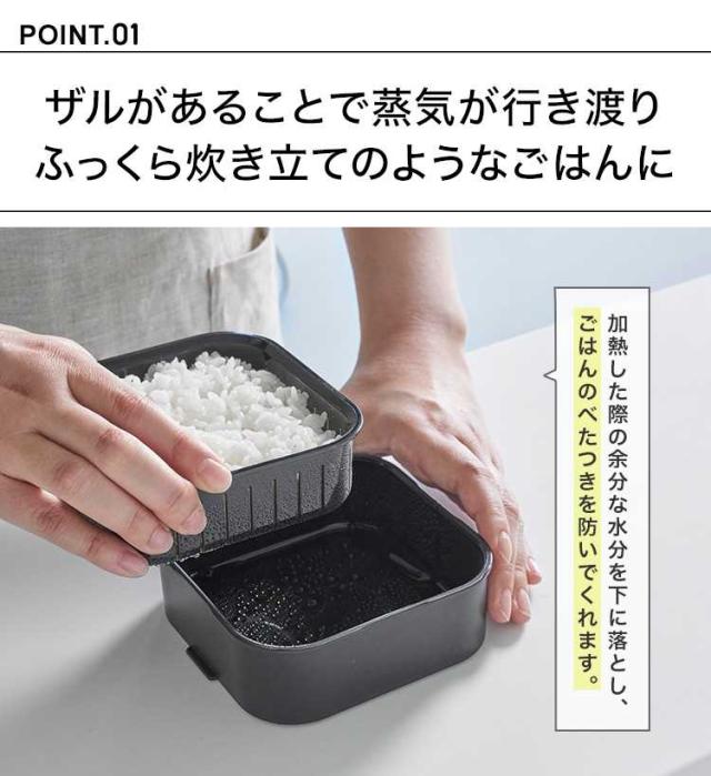 ザル付きなので、蒸し器のように蒸気が全体に行き渡り、温まりやすく一膳分(150g)の冷凍ごはんがふっくらと炊き立てのように仕上がる容器です。加熱した際の余分な水分を落とし、ごはんのべたつきを防ぎます。野菜やシュウマイの蒸し調理の際にも便利です。容器下部には突起部分があり蓋が開けやすい構造です。