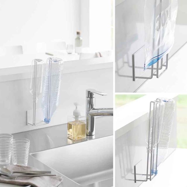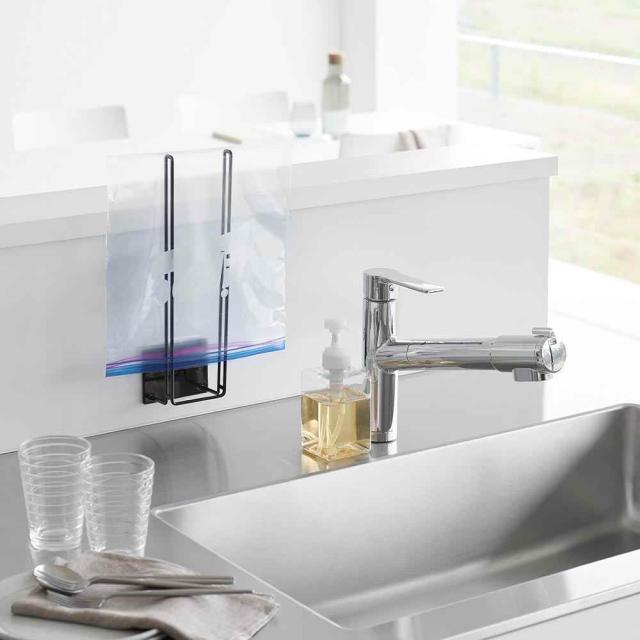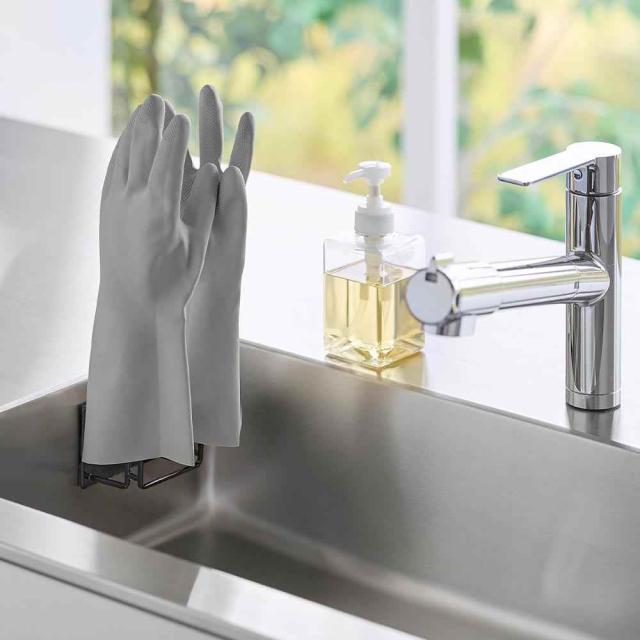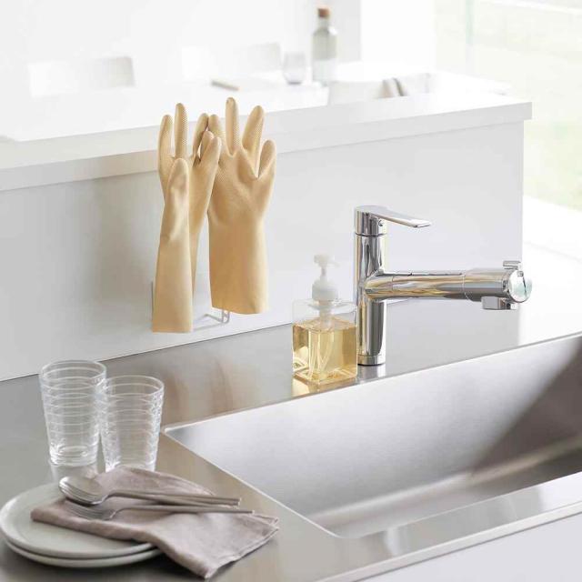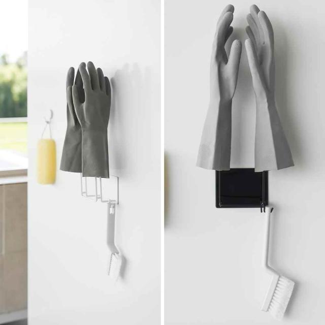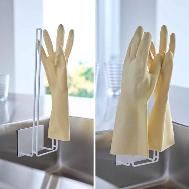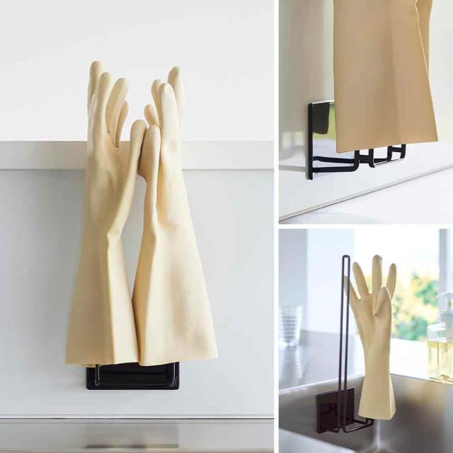マグネットで簡単取り付け。置き場所に困るゴム手袋を収納できるグローブホルダー。シンク中に設置すれば、使用後そのままホルダーに収納するだけで「乾かす・収納」が一度で完結します。スプレーボトルなどの掃除アイテムも引っ掛けることができます。キッチンパネルに設置すれば食品保存袋やペットボトルを乾かす際にも便利です。フックが1つ付属しています。