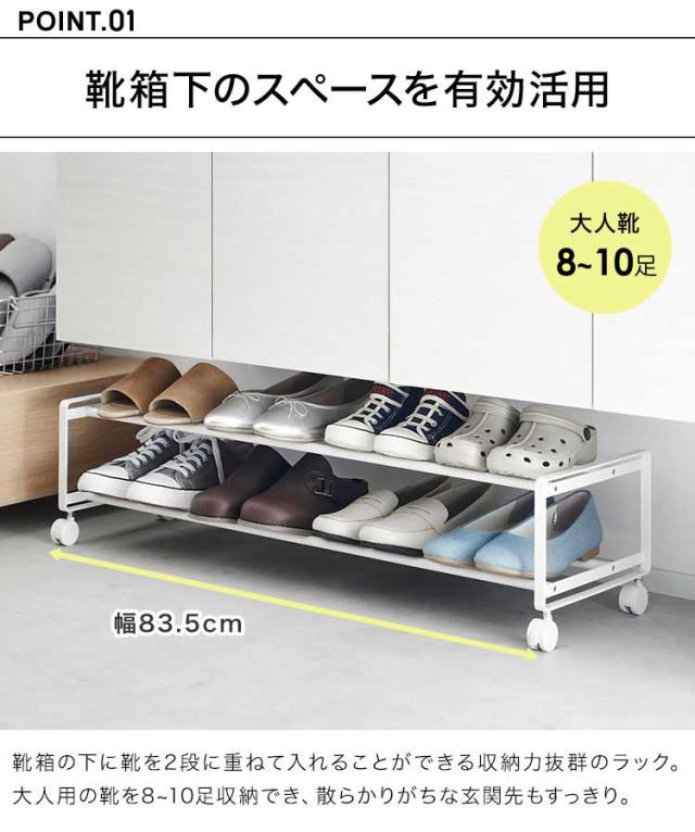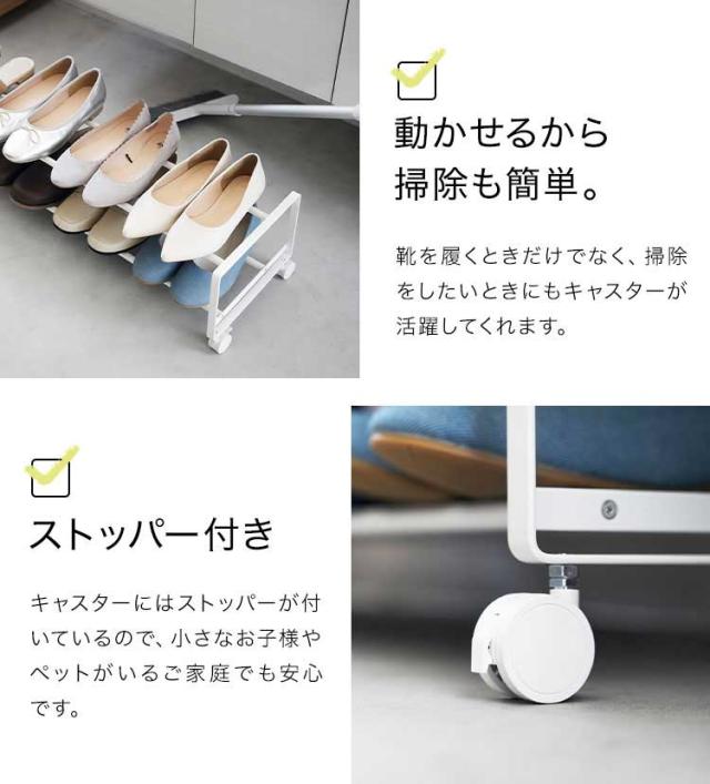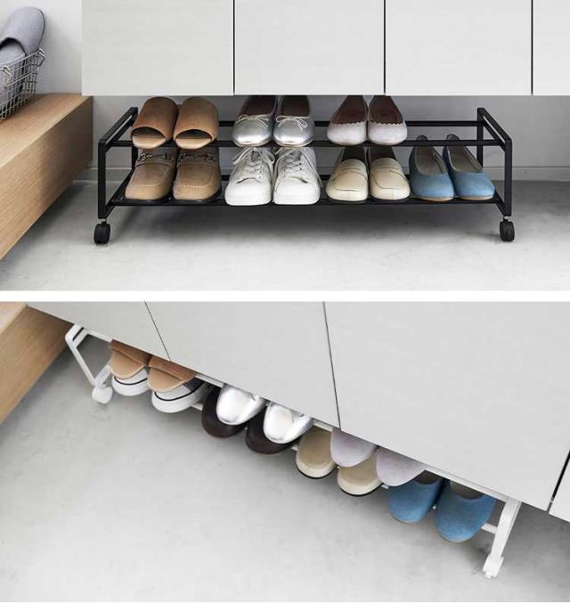 キャスター付きで、お子様の靴や日常履きの靴などがサッと取り出せるシューズラック。上下2段で大人用の靴が8~10足ほど収納でき、靴箱下の空きスペースを有効活用できます。動かせるので掃除も手軽になり、玄関先をすっきり綺麗に。お子様やペットがいる家でも安心なストッパー付き。