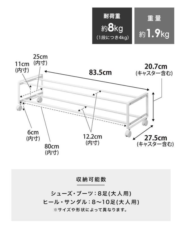 Details 引き出せるキャスター付きシューズラック 2段 キャスター付きで、お子様の靴や日常履きの靴などがサッと取り出せるシューズラック。上下2段で大人用の靴が8~10足ほど収納でき、靴箱下の空きスペースを有効活用できます。動かせるので掃除も手軽になり、玄関先をすっきり綺麗に。お子様やペットがいる家でも安心なストッパー付き。 ブランド名 tower / タワー 品番 1624/1625 JAN 4903208016247/4903208016254 サイズ 約H20.7×W83.5×D27.5cm(キャスター含む) 収納可能数 シューズ・ブーツ:8足(大人用) ヒール・サンダル:8〜10足(大人用) ※サイズや形状によって異なります。 耐荷重 8kg(上下段各4kg) ※静止荷重 重量 約1.9kg 素材 本体:スチール(粉体塗装) キャスター:ナイロン 生産国 中国 備考 組立式 付属品 六角レンチ、スパナ ご注意 ※表記サイズより、多少の誤差があることがございます。 ※商品の画像はできる限り実物に近づけるよう配慮しておりますが、お使いのモニターやご覧になる環境によりましてはカラーの見え方に差が出る場合がございます。ご了承くださいませ。 関連キーワード 山崎実業 引き出せるキャスター付きシューズラック 2段 タワー tower スリム 省スペース 薄型 大容量 幅80 83.5cm 下駄箱下 靴箱下 玄関 隙間 靴 収納 靴置き 8足 10足 1624 1625 yamazitu 山実 おしゃれ コンパクト スタッキング シンプル スチール ホワイト ブラック 白 黒 10代 20代 30代 40代 50代 60代 70代 80代 大学生 女性 女子 女の子 ガールズ レディース 男性 男子 男の子 ボーイズ メンズ シニア おじいちゃん おばあちゃん お爺ちゃん お婆ちゃん 祖父 祖母 じいじ ばあば 誕生日 プレゼント プチ ミニ ギフト お祝い お返し 粗品 景品 送別会 イベント 母の日 父の日 クリスマス クリスマスプレゼント バレンタイン チョコ以外 ホワイトデー おしゃれ オシャレ お洒落 かわいい 可愛い カワイイ かっこいい カッコいい カッコイイ モノトーン モノクロ スタイリッシュ ナチュラル モダン 無地 北欧 シンプル おしゃれ オシャレ お洒落 モノトーン スマート 新生活 引越し 引っ越し 新築 結婚 祝い 新居 マンション アパート 一人暮らし ひとり暮らし 1人暮らし 二人暮らし ふたり暮らし 2人暮らし ファミリー 家族 一戸建て 戸建 賃貸 便利 生活雑貨 整理整頓 スペース 有効活用 玄関 ウォークインクローゼット 押入れ 屋内 屋外 会社 オフィス 隙間収納 収納雑貨 整理用品 山実 やまじつ ヤマジツ やまざきじつぎょう たわー towerシリーズ ブランド インテリアブランド | |||||||||||||