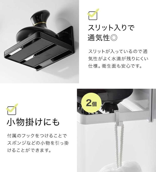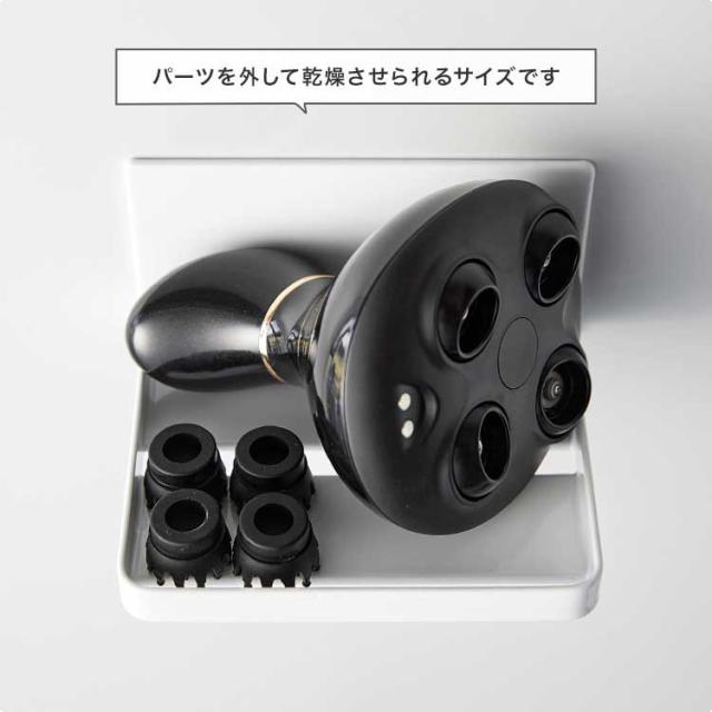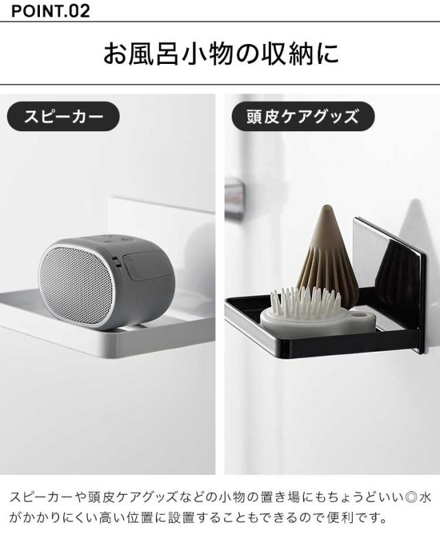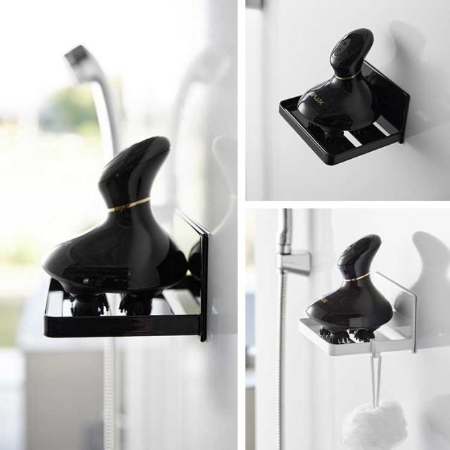 お風呂で使える防水の頭皮マッサージ器をマグネットで浮かせて収納することができるラックです。お風呂で使う美容アイテムの指定席にぴったり。シャワーで濡れない位置に取り付けできるので安心です。パーツを外して乾燥させる事ができるサイズです。スピーカーなどを置いてもご使用いただけます。フック付きで小物を掛ける事ができます。