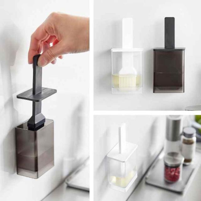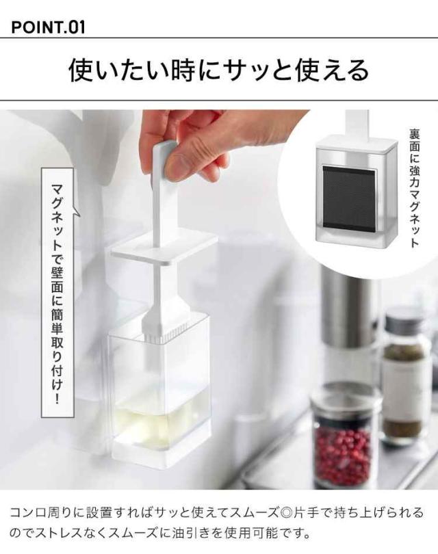 コンロ周りの壁面にマグネットで簡単に取り付けできる、サッと使えて便利なシリコーン製の油引き。浮かせて取り付けできるので衛生的!シリコーン製のブラシは少ない油で薄く塗り広げられます。容器の口が広く注ぎやすい。ブラシは食洗機で洗えます。