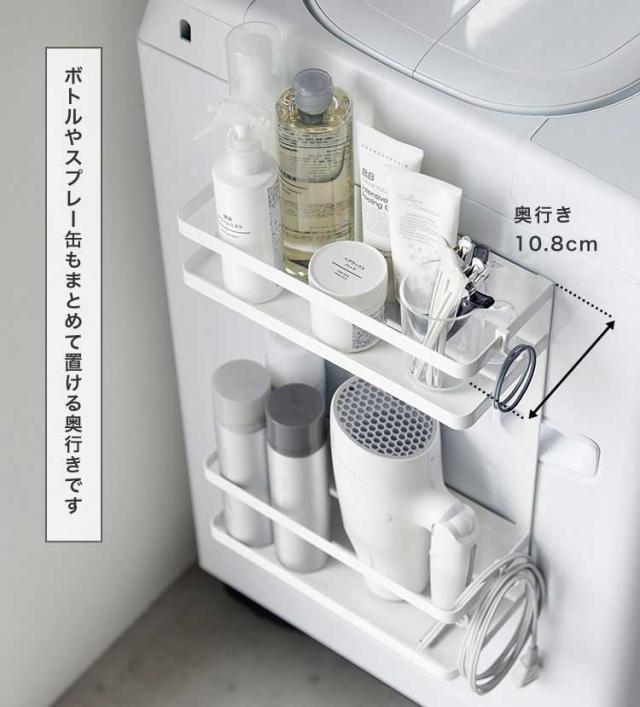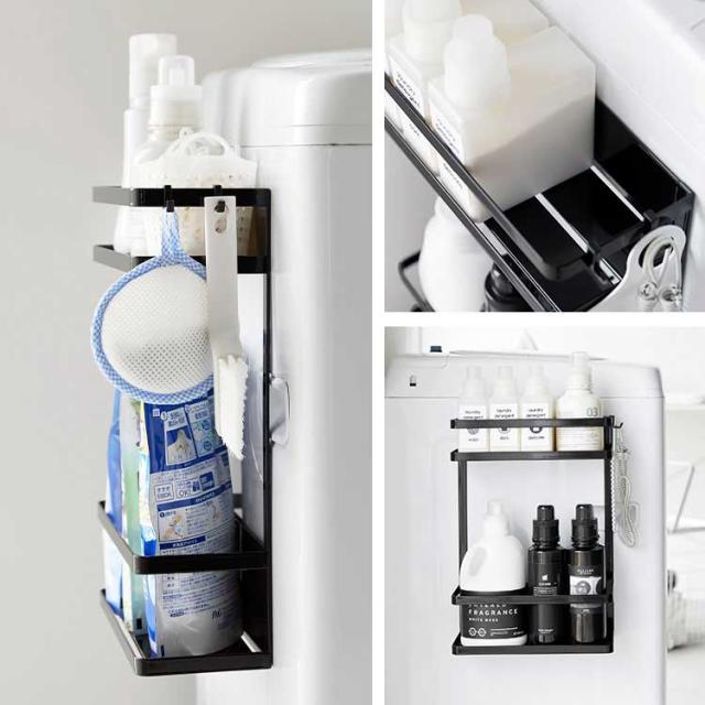 マグネットで洗濯機の側面に簡単に設置できる収納ラック。強力な磁力で最大4.5kgの耐荷重性があり、下段には大容量の洗剤の詰め替えやストックも置くことができて便利です。洗剤の他にも化粧品やドライヤーの収納にも便利。掃除道具などを引っ掛けておけるフックも2つ付属しています。