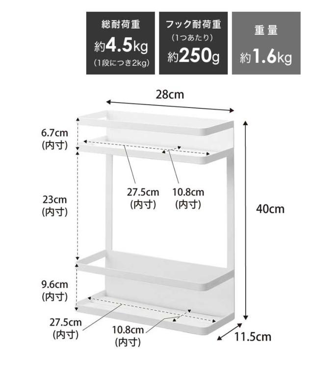 Details 洗濯機横マグネット収納ラック 2段 マグネットで洗濯機の側面に簡単に設置できる収納ラック。強力な磁力で最大4.5kgの耐荷重性があり、下段には大容量の洗剤の詰め替えやストックも置くことができて便利です。洗剤の他にも化粧品やドライヤーの収納にも便利。掃除道具などを引っ掛けておけるフックも2つ付属しています。 ブランド名 tower / タワー 品番 1800/1801 JAN 4903208018005/4903208018012 サイズ H40×W28×D11.5cm 重量 約1.6kg 素材 本体:スチール(粉体塗装)、マグネット 滑り止め:シリコーン 耐荷重 本体:4.5kg(上段・下段:各2kg フック1つあたり:250g) 生産国 中国 ご注意 ※表記サイズより、多少の誤差があることがございます。 ※商品の画像はできる限り実物に近づけるよう配慮しておりますが、お使いのモニターやご覧になる環境によりましてはカラーの見え方に差が出る場合がございます。ご了承くださいませ。 関連キーワード 山崎実業 洗濯機横マグネット収納ラック 2段 タワー tower 洗濯機 マグネット 収納 洗剤 置き場 かご ストッカー ランドリー 省スペース 隙間収納 1800 1801 yamazitu 山実 フック 大容量 棚 磁石 貼り付け 引っ掛け 浮かせ収納 おしゃれ シンプル 白 黒 ブラック ホワイト 10代 20代 30代 40代 50代 60代 70代 80代 大学生 女性 女子 女の子 ガールズ レディース 男性 男子 男の子 ボーイズ メンズ シニア おじいちゃん おばあちゃん お爺ちゃん お婆ちゃん 祖父 祖母 じいじ ばあば 誕生日 プレゼント プチ ミニ ギフト お祝い お返し 粗品 景品 送別会 イベント 母の日 父の日 クリスマス クリスマスプレゼント バレンタイン チョコ以外 ホワイトデー おしゃれ オシャレ お洒落 かわいい 可愛い カワイイ かっこいい カッコいい カッコイイ モノトーン モノクロ スタイリッシュ ナチュラル モダン 無地 北欧 シンプル おしゃれ オシャレ お洒落 モノトーン スマート 新生活 引越し 引っ越し 新築 結婚 祝い 新居 マンション アパート 一人暮らし ひとり暮らし 1人暮らし 二人暮らし ふたり暮らし 2人暮らし ファミリー 家族 一戸建て 戸建 賃貸 便利 生活雑貨 整理整頓 スペース 有効活用 水回り 風呂場 ランドリールーム キッチン 磁石 マグネット スチール スリム 省スペース コンパクト ワイド 大きめ 隙間収納 収納雑貨 整理用品 山実 やまじつ ヤマジツ やまざきじつぎょう たわー towerシリーズ ブランド インテリアブランド | |||||||||||||