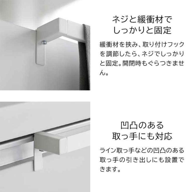 ※設置する引き出し・扉のサイズや厚み、形状、材質によっては取り付けできない場合があります。>