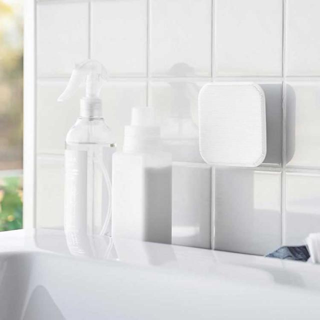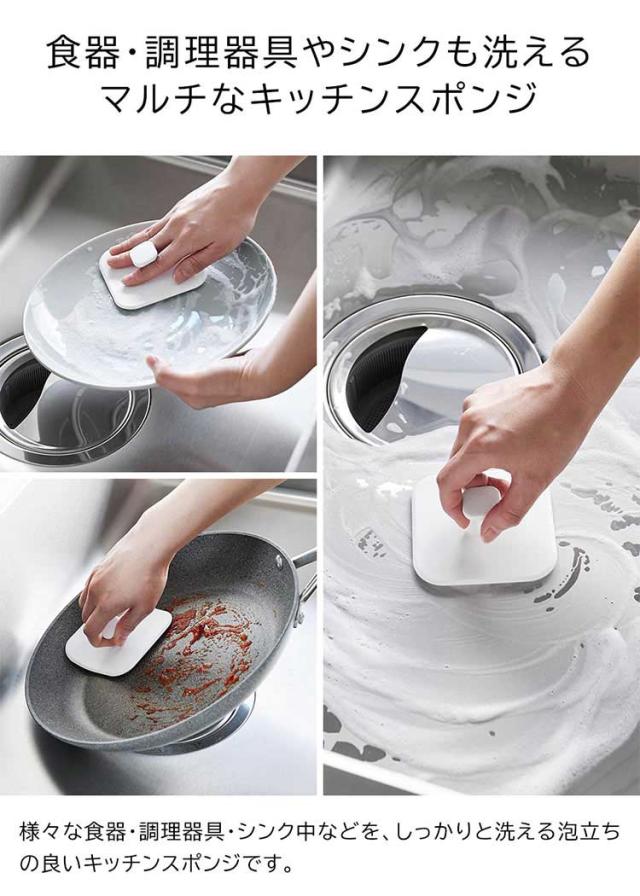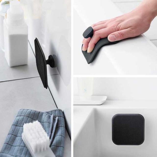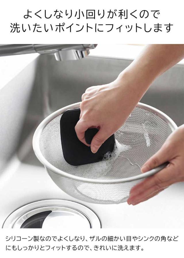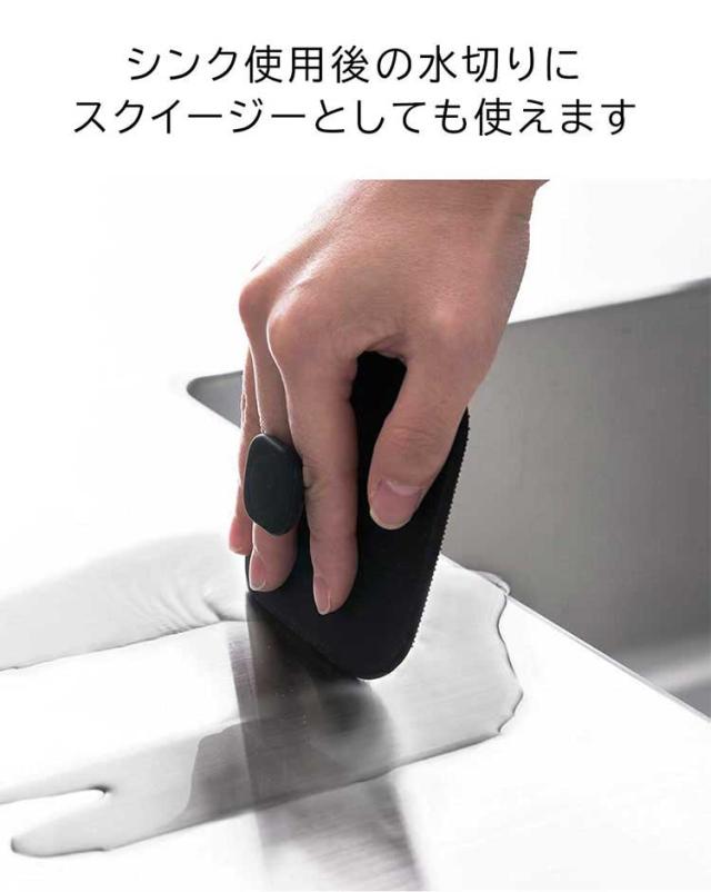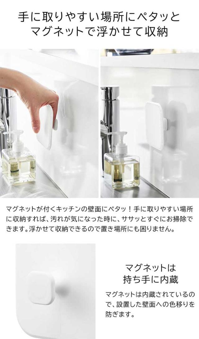 マグネットがつく壁面に簡単設置。小回りがきく柔らかいシリコーン製スポンジ。食器やザルの細かい網目などの調理器具やシンク中までしっかり洗える泡立ちのいいスポンジです。スポンジ面が壁面に触れないので、乾きやすく衛生的です。スクイージーにもなるので、キッチンやシンク周りの水切りに。