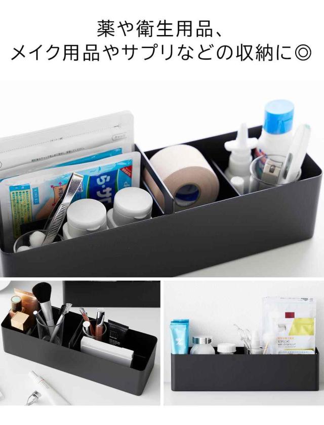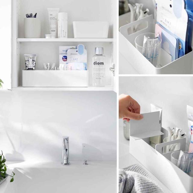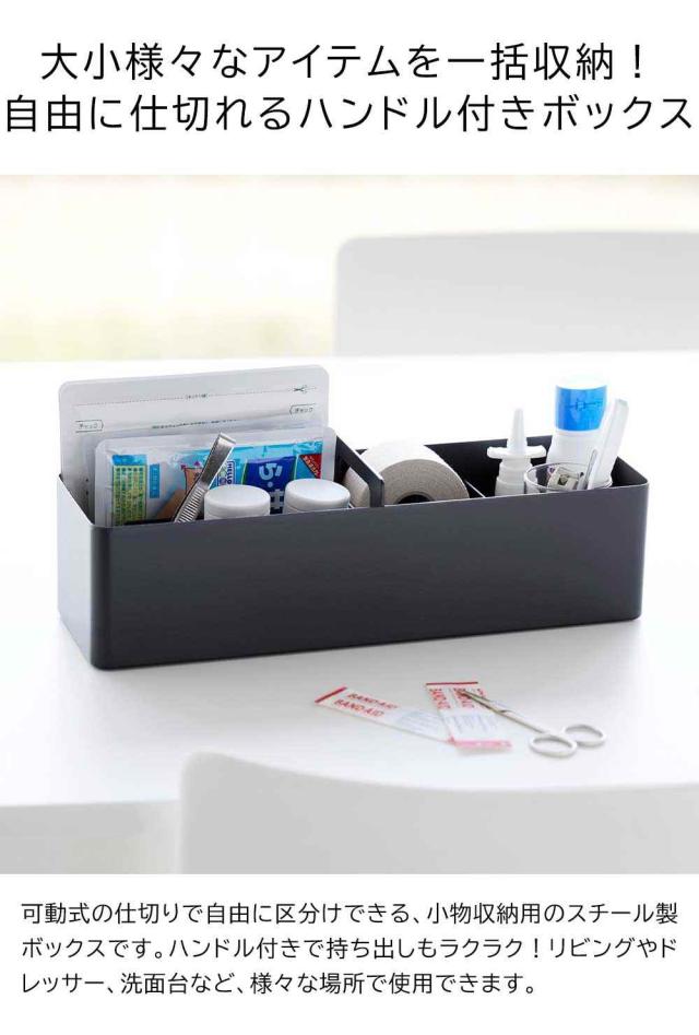 小物の収納に便利な、ハンドル付きのスリムなボックス。マグネット付きの可動式仕切りは、自由に仕切ることができるので小物やシートマスク、湿布なども収納しやすく便利。薬や衛生用品、メイク用品などの持ち運びしたいアイテム収納に便利です。
