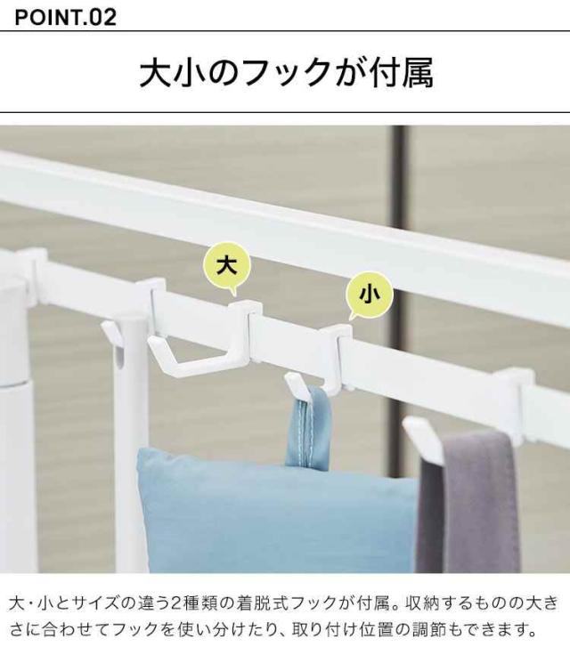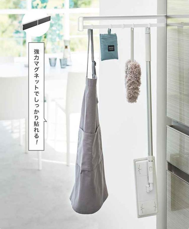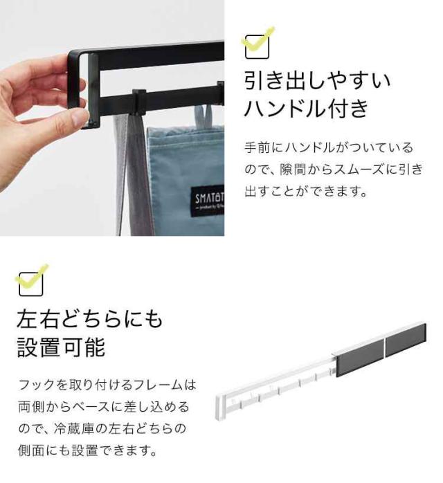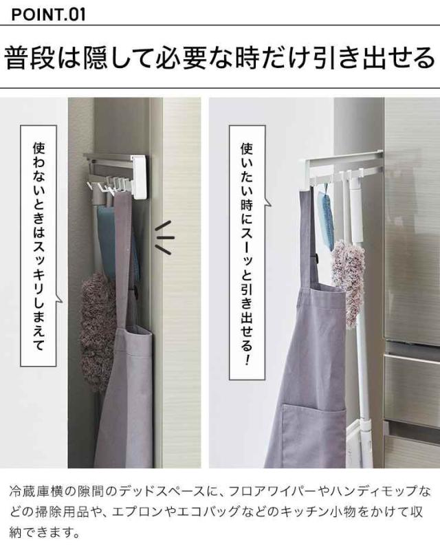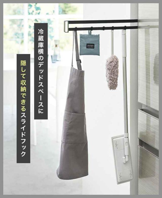 冷蔵庫横の隙間を有効活用!必要な時だけ引き出せるスライドフック。マグネットで冷蔵庫横に簡単取り付けできます。冷蔵庫横に、フロアワイパーやハンディモップなどの掃除用品や、エプロンやエコバッグなどのキッチン小物をかけて収納できます。収納する物に合わせて使い分けできる大小2種類のフックが付属。冷蔵庫専用。