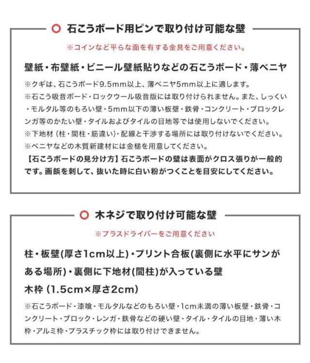 木ネジ使用時:柱・板壁(厚さ1cm以上)・プリント合板(裏側に水平にサンがある場所)・裏側に下地材(間柱)が入っている壁・木枠(厚さ2cm以上)