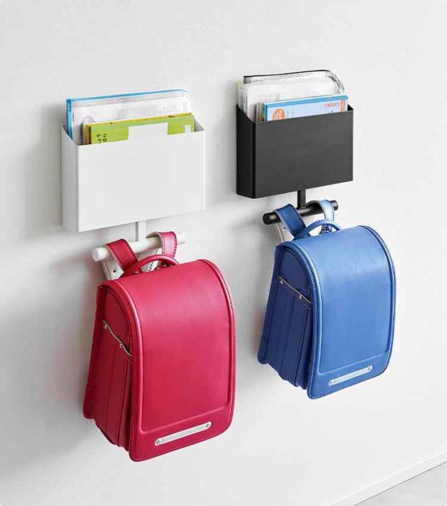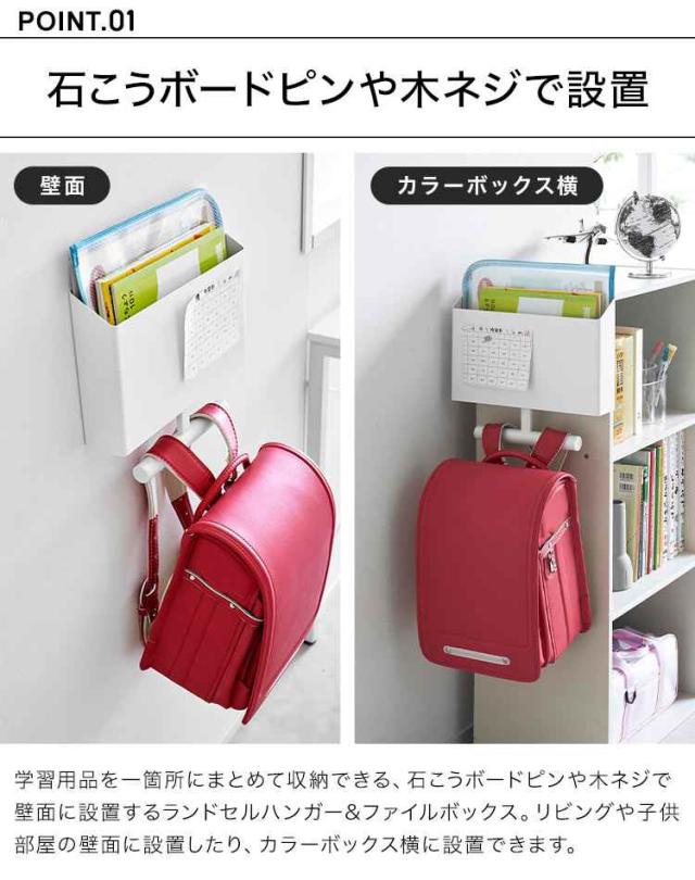ランドセルや宿題、連絡帳やプリントなど、通学に必要な学習用品を一箇所にまとめて収納できる!石こうボードピンで壁面に設置するランドセルハンガー&ファイルボックスです。木ネジでも取り付け可能です。お子様の持ち物を一括収納!