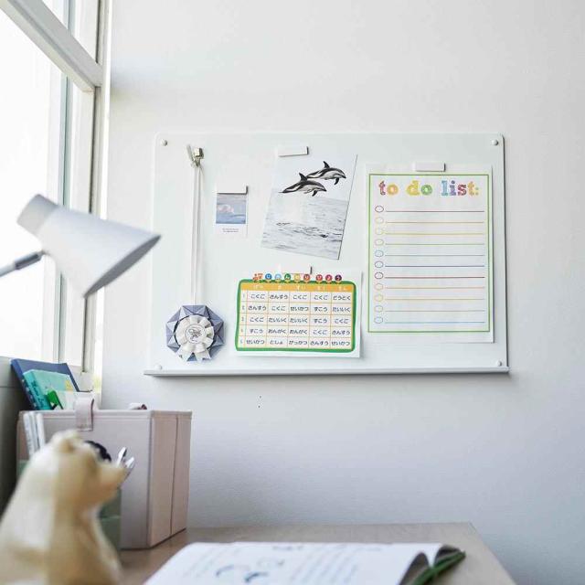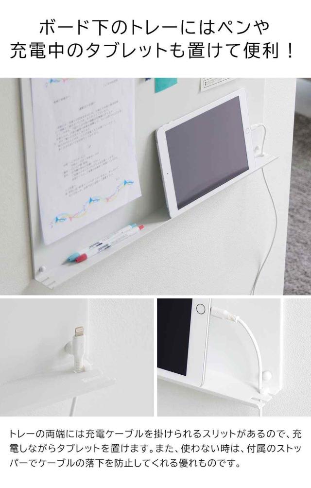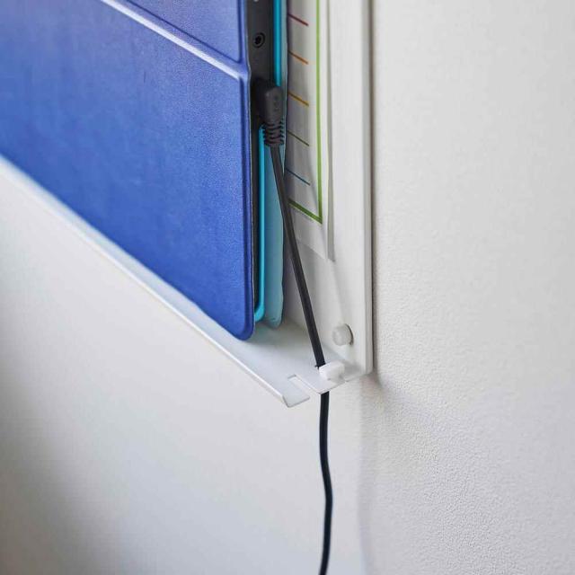 お子様の学習用プリントやタブレットの収納にも便利なトレー付きプリントボード。ボード下のトレーにはペンや充電中のタブレットも置けて便利◎付属のストッパーで、ホルダーに引っ掛けた充電ケーブルの落下を防止できます。