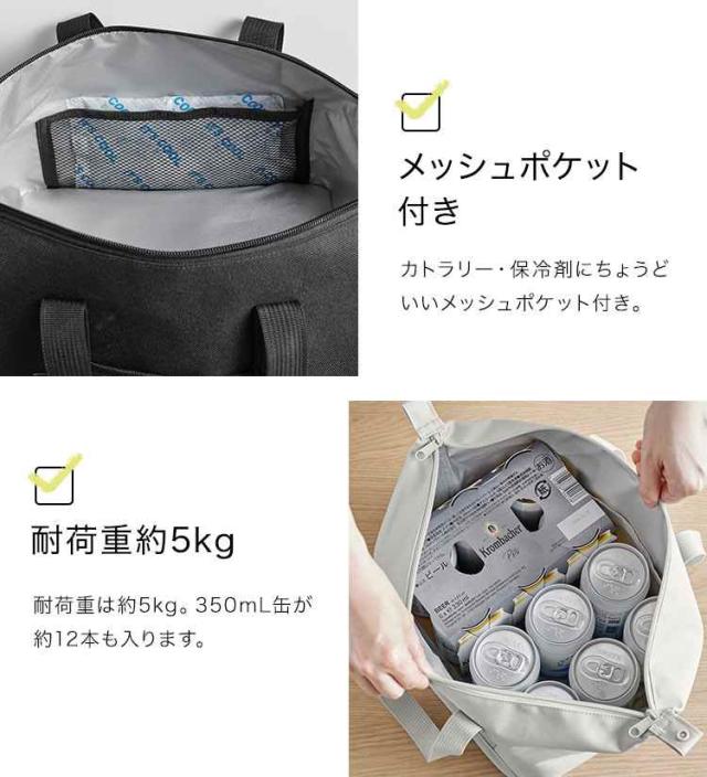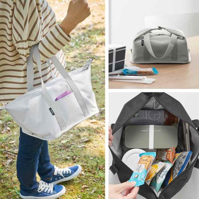 マチが広くて、大きなスーパー・コンビニの弁当を傾けずに持ち運べるお弁当バッグ。保温・保冷で温度もキープします。使い終わった後はコンパクトに収納可能。汚れや、においが気になったらおうちで丸洗いできて衛生的です。350mL缶が約12本も入り、行楽シーズンにもおすすめです。カトラリー・保冷剤が入るメッシュポケット付き。入れる物やサイズに合わせてお好きなホックの留め方を選べます。
