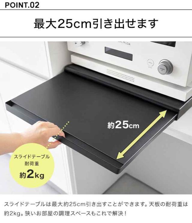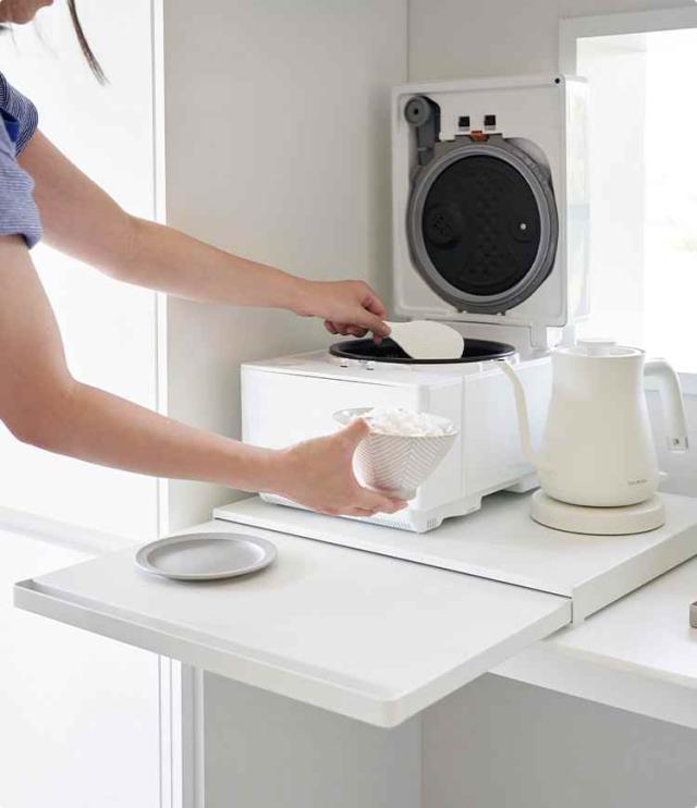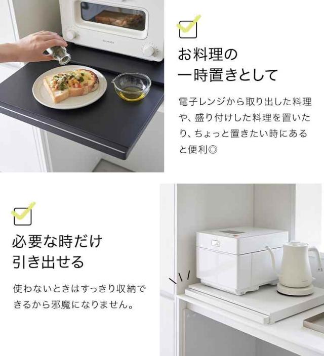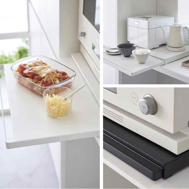 電子レンジや炊飯器、ケトルなど家電の下に便利な作業スペースを作ることができるキッチンスライドテーブル。必要な時だけ引き出せるから家事効率アップ!調理スペースとして、お料理の一時置きとして使用できます。使わないときはスッキリ収納できるので邪魔になりません。スライドで最大約25cm引き出すことができます。キッチンのスペースが狭いお部屋の調理スペースもこれで解決◎。