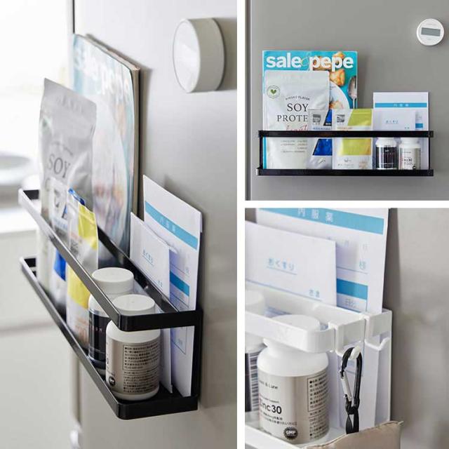 冷蔵庫の横にマグネットで簡単取り付けできるラック。常備薬やサプリメント、調味料を一括収納!置き場所に困る袋入り調味料やスパイス、オイル等をまとめて収納できます。幅の違う仕切りになっていて薄型の袋を立てかけることができます。サイズの違うトレーの収納にも便利です。フックが付いているので小物も吊り下げて収納可能。マグネットがつくキッチンパネルにも設置できます。