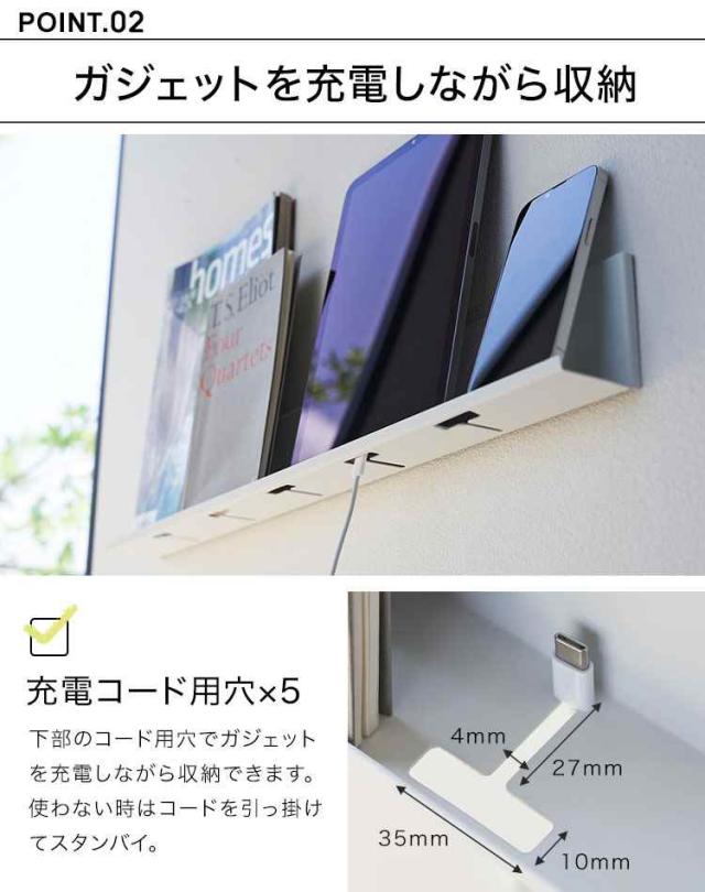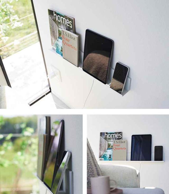 壁の穴が目立ちにくい石こうボードピンや木ネジを使い、スマートに設置できるスリムなラック。下にコード用の穴が開いているので、各種ガジェットを充電したまま収納可能。充電をしない時には充電ケーブルの先端を引っ掛けて収納できます。タブレットPC以外にもリモコンや時計・メガネ置きとしても便利です。取り付けベースを取り付けてはめ込むだけで工具などが不要なのも嬉しいポイント。リビングや寝室など場所を選ばないシンプルなデザインです。
