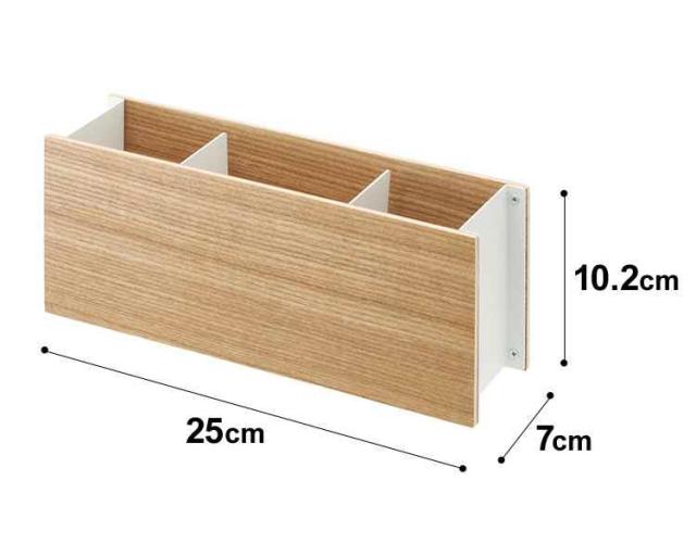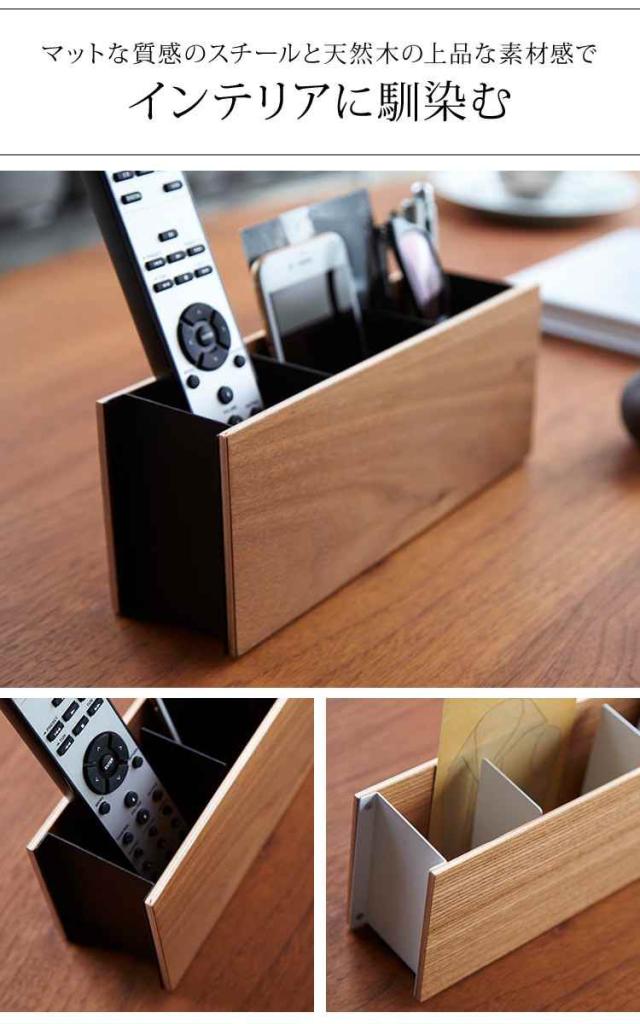 テレビやエアコンのリモコン、ステーショナリーをひとまとめに収納できるRINのリモコンラック。二つの仕切りで小物やペン、メガネなど細かく分けて収納できるので見た目スッキリ。仕切りには小さな隙間があるので、ダイレクトメッセージなどの紙類も綺麗に収納することができ便利です。
