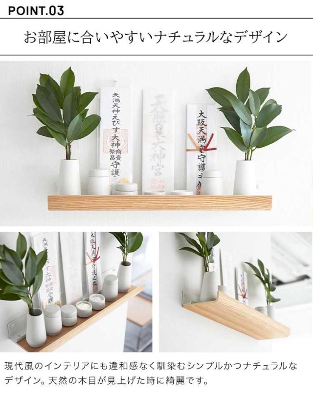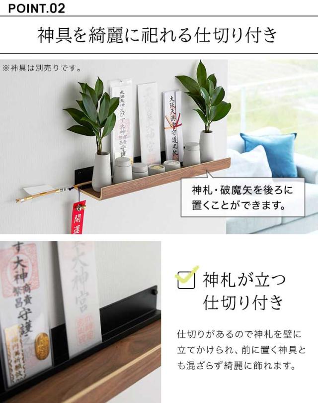 現代風インテリアの部屋にも合わせやすいシンプルでナチュラルなデザインの神棚。お手持ちの神具と合わせて使うことができ、神札が立つように仕切りがついています。壁の穴が目立ちにくい石こうボードピンで、工具や強い力の必要なく簡単に壁に取り付けられます。※神具、神札、破魔矢は付属しておりません。