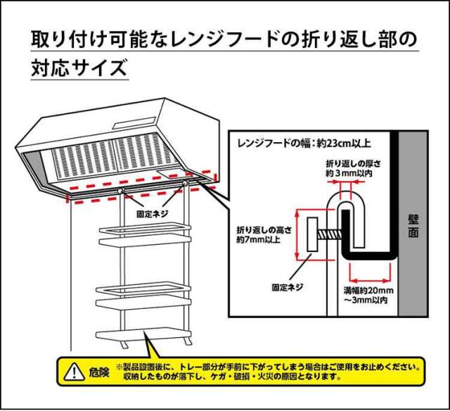 | レンジフード対応サイズ | レンジフードの幅:約25.5cm以上 折り返しの厚さ:約3mm以内 折り返しの高さ:約7mm以上 溝幅:約2〜3mm以上 |