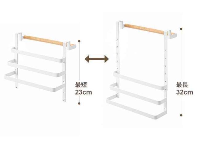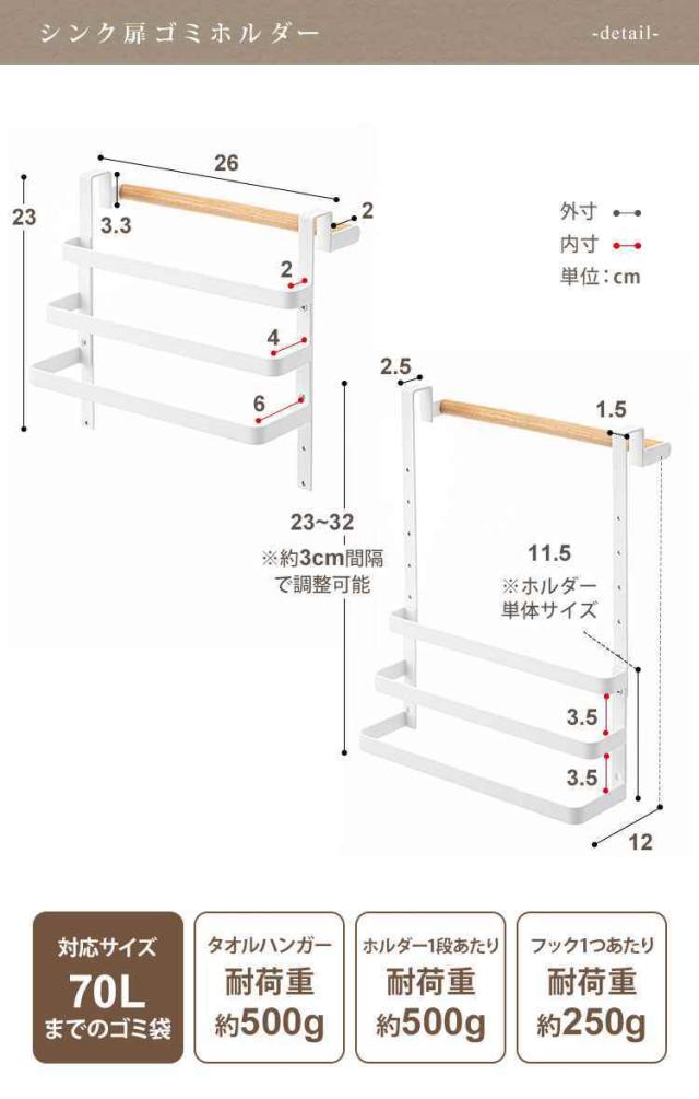 | サイズ | ■本体:約幅26×奥行13.5×高さ23〜32cm ■ゴミ袋ホルダー:約幅26×奥行7×高さ11.5cm [ 内寸 ] □タオルハンガー:約 幅25.5×奥行2cm □ゴミ袋ホルダー 長:約 幅25.5×奥行6cm □ゴミ袋ホルダー 中:約 幅25.5×奥行4cm □ゴミ袋ホルダー 短:約 幅25.5×奥行2cm |
