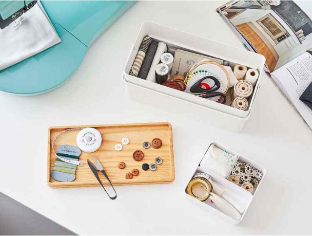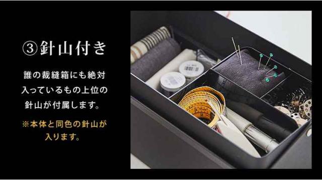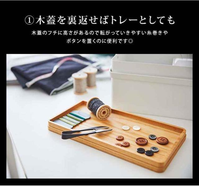 | 素材 | 容器:スチール(粉体塗装) 蓋:天然木(ラッカー塗装) トレー:ABS樹脂 針山:綿100% クッション材:ポリエステル |