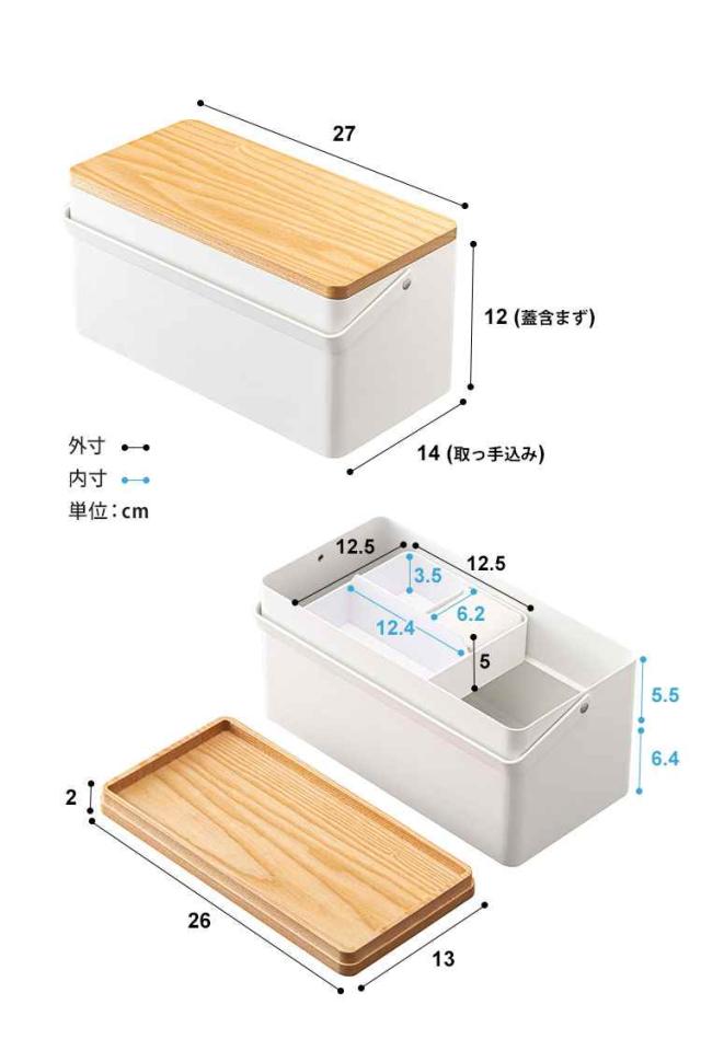 | 商品サイズ | ■本体:約高さ13.5×横27×奥行14(取っ手込み)cm □内寸:約高さ5.5(上段)・6.4(下段)×横25.5×奥行12.5cm ■木蓋:約高さ2×横26×奥行13cm ■付属トレー(外寸):約高さ5×横12.5×奥行12.5cm □付属トレー内寸:(大)約高さ3.5×横12.4×奥行5.8cm (左小)約高さ3.5×横6.2×奥行6.2cm (右小)約高さ3.5×横6×奥行6.2cm ■針山:約高さ4×横6×奥行6cm ※表記サイズより、多少の誤差があることがございます。 |