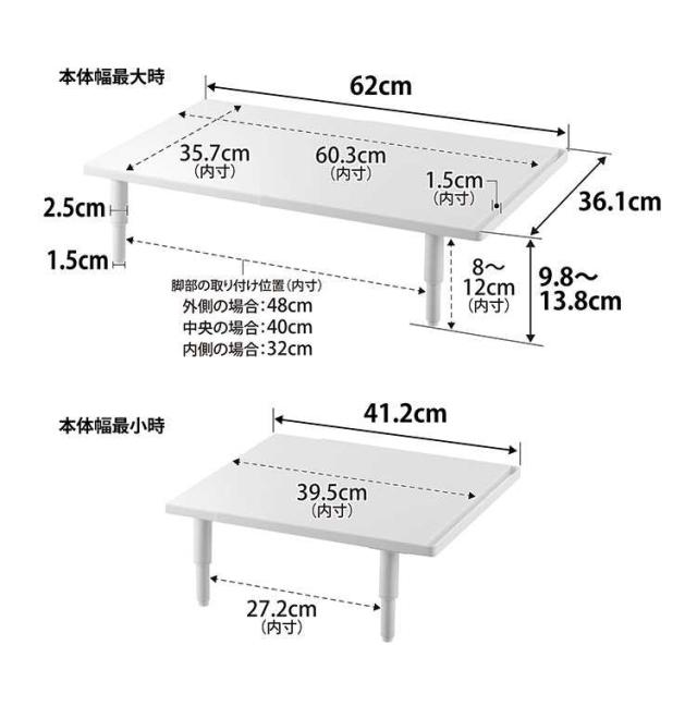 脚(アジャスター部)の間隔:本体幅最小時27.2cm / 本体幅最大時48cm・40cm・32cm