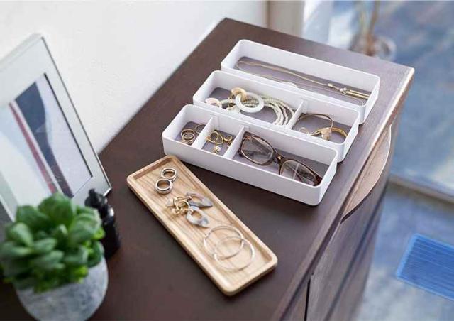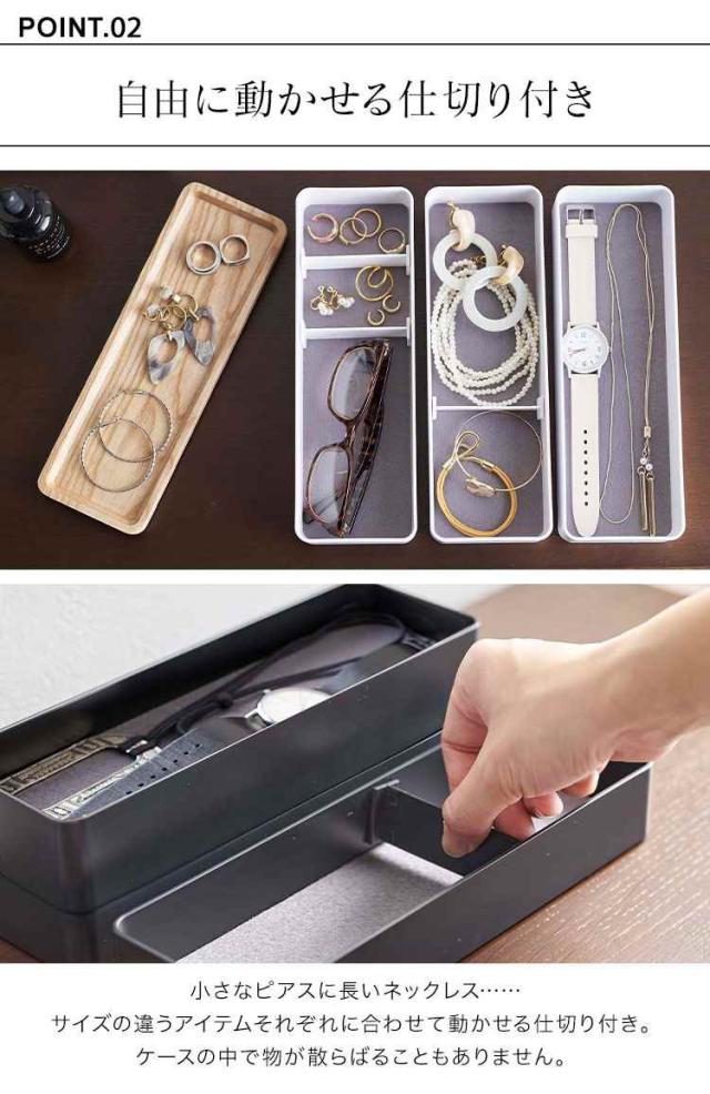 どんな場所にも綺麗に収まるスリム形状とデザインが嬉しい、 トレーとして使える木葢付きのシンプルなアクセサリーケース。 各ケースにはフェルトマットがついており、大事なアクセサリーを傷つけず収納できます。 入れるものに合わせて取り付け可能な仕切り付き。
