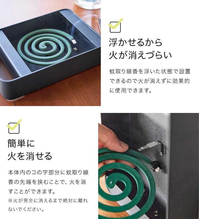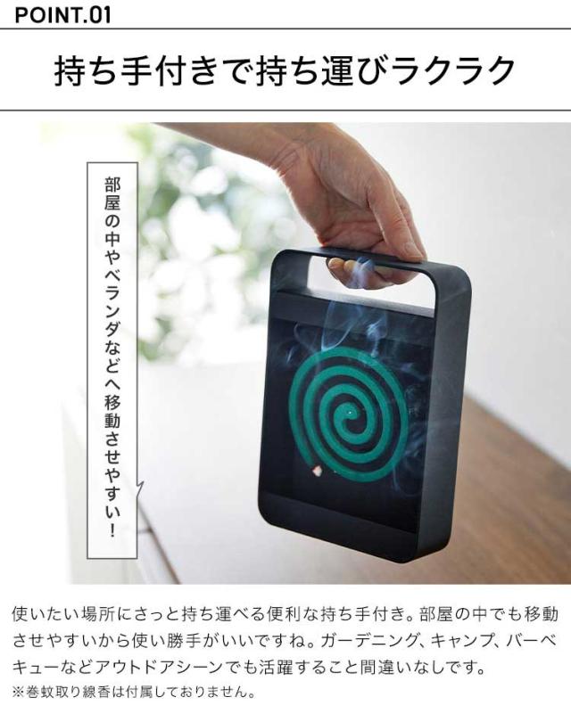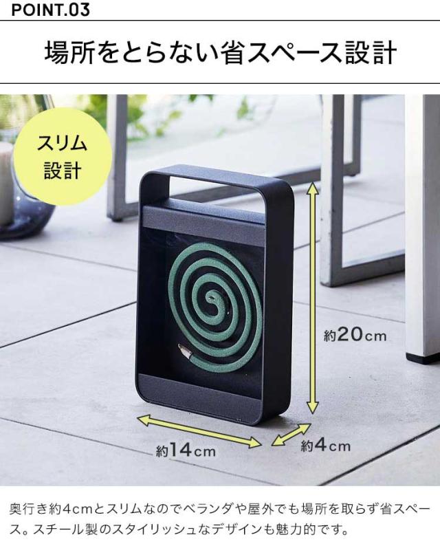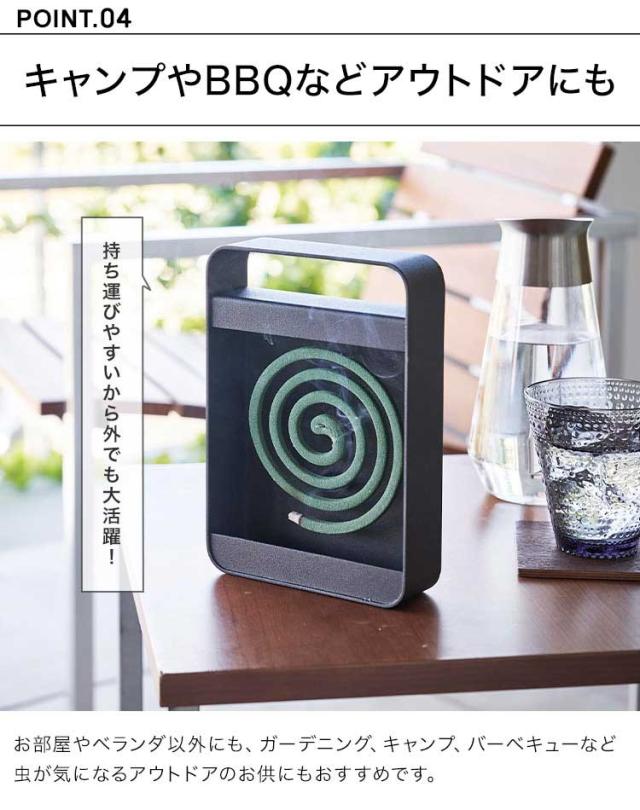 持ち運びができるハンドル付きの巻蚊取り線香スタンド。巻蚊取り線香を立てても、寝かせた状態でも使えます。ガーデニングやキャンプなどのアウトドアにも。持ち手がついてるので持ち運びに便利です。ベランダや屋外でも場所を取らない省スペース設計で、蚊取り線香を浮いた状態で設置できるので火が消えずに効果的に使用できます。本体内のコの字部分に蚊取り線香の先端を挟むことで、火を消すことができます。※火が完全に消えるまで絶対に離れないでください。また蚊取り線香をコの字部分で折り、再び使い始めることも可能です。※巻蚊取り線香スタンドは付属していません。