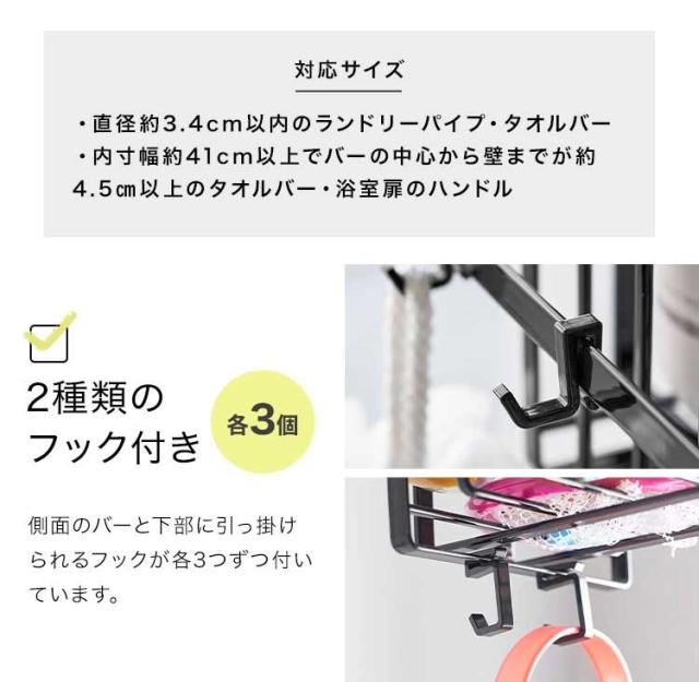 Details 引っ掛けバスルームバスケット ワイド ランドリーパイプに引っ掛けて、バス用品や掃除用品を浮かせて収納できるワイドな大容量バスケット。設置面が少なく、風通しがよいのでぬめりにくくお手入れが簡単です。ディスペンサー・チューブをまとめて収納でき、手前のバーにはタオルなどを掛けられます。水切れがよいのでおもちゃの収納にも便利。タオルバーに引っ掛けて、バスブーツやスプレー、掃除用品などをまとめて一括収納も。風通しがよく、乾きやすい浴室扉のハンドルにも浮かせて収納が可能。床に置いて使用することもできます。風呂イスに座ったままでもディスペンサーなどが取り出しやすい高さ設計。2種類のフック付きです。 ブランド名 tower / タワー 品番 6617/6618 サイズ 約H37×W40.5×D16.5cm 内寸 バスケット:約W39.4×D13.4×H13cm 上部バー:約W39.4×D2.5cm 対応サイズ 直径約3.4cm以内のランドリーパイプ・タオルバー 内寸幅約41cm以上でバーの中心から壁までが約4.5?以上のタオルバー・浴室扉のハンドル 重量 約1300g 耐荷重 バスケット:約4? 上部バー:約750g フック1つあたり:約250g 素材 本体:スチール(ユニクロメッキ+粉体塗装) 付属品 各フック×3 クッション×6 生産国 中国 ご注意 ※表記サイズより、多少の誤差があることがございます。 ※商品の画像はできる限り実物に近づけるよう配慮しておりますが、お使いのモニターやご覧になる環境によりましてはカラーの見え方に差が出る場合がございます。ご了承くださいませ。 関連キーワード スポンジ ボトル 掃除用品 トリートメント 洗顔 ディスペンサー チューブ おもちゃ 水切れがいい 床置き ホワイト ブラック 白 黒 おしゃれ シンプル 滑り 水あか 防止 フック 2種類 吊るせる 掛ける 引っかけ 浮かす 新生活 引越し 1ヶ月 2ヶ月 3ヶ月_ 4ヶ月_ 5ヶ月_ 6ヶ月_ 7ヶ月_ 8ヶ月_ 9ヶ月_ 10ヶ月_ 11ヶ月_ 12ヶ月_ 1歳 2歳 3歳 4歳 5歳 6歳 7歳 8歳 9歳 10歳 10代 20代 30代 40代 50代 60代 70代 80代 小学 1年 2年 3年 4年 5年 6年 一年 二年 三年 四年 五年 六年 生 小学校 中学校 高校 大学 小学生 中学生 高校生 大学生 保育園 保育所 幼稚園 先生 学生 学校 入園 入学 準備 入園準備 入学準備 通園 通学 通勤 子ども 子供 こども キッズ ジュニア 赤ちゃん ベイビー ベビー 女性 女子 女の子 ガールズ レディース 男性 男子 男の子 ボーイズ メンズ シニア おじいちゃん おばあちゃん お爺ちゃん お婆ちゃん 祖父 祖母 じいじ ばあば 誕生日 プレゼント プチ ミニ ギフト お祝い お返し 粗品 景品 送別会 イベント 母の日 父の日 クリスマス クリスマスプレゼント バレンタイン_チョコ以外 ホワイトデー おしゃれ オシャレ お洒落 かわいい 可愛い カワイイ シンプル かっこいい カッコいい カッコイイ | |||||||