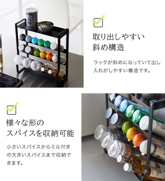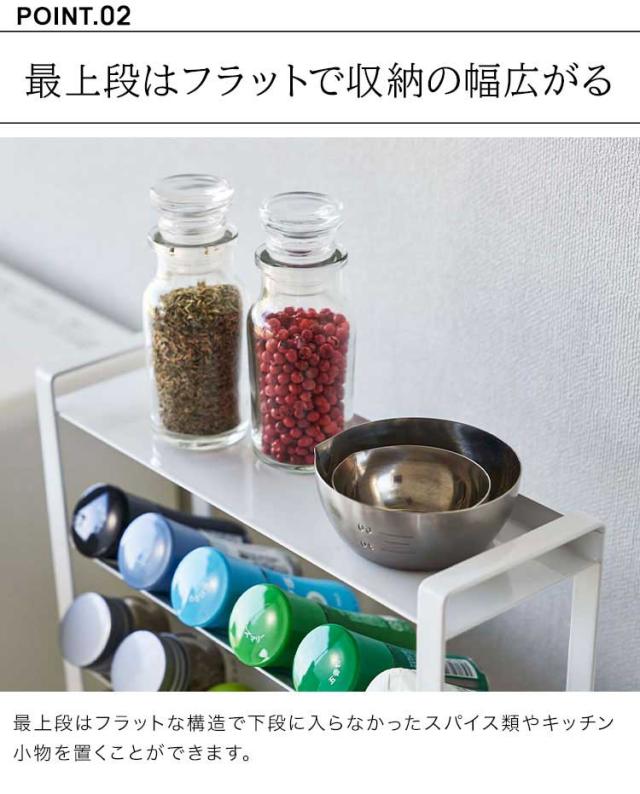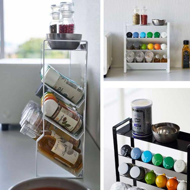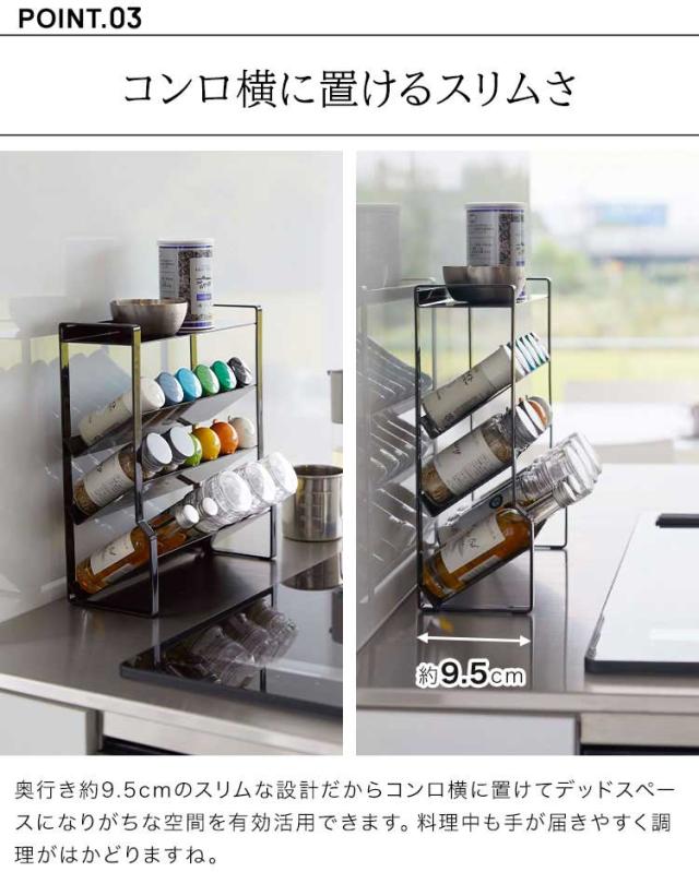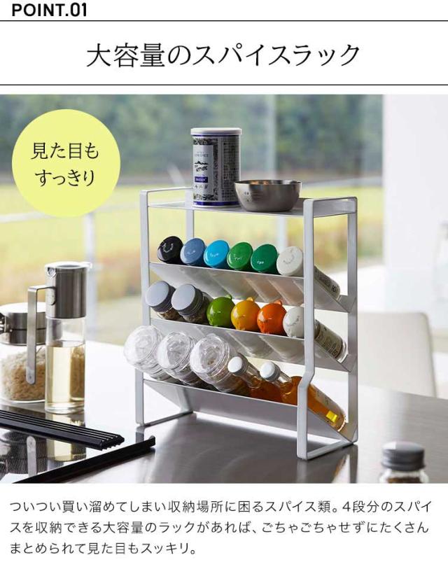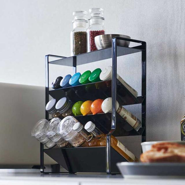 約幅24×奥行き9.5cmのスリムなスペースに、棚4段分のスパイス類が収納できる大容量のラック。ついたくさん買ってしまうスパイス類を省スペースに収納できます。小さなスパイスから、ミル付きの大きめのスパイスまで様々な種類の調味料を収納可能。斜めになっていて出し入れがしやすい構造。最上段はフラットになっているので下段に入らない物も収納可能。調理台・コンロ横・カウンターなど様々な場所で使用可能です。
