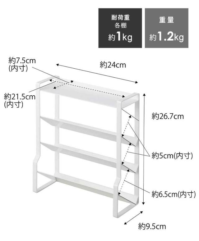 Details スリムスパイスラック4段 約幅24×奥行き9.5cmのスリムなスペースに、棚4段分のスパイス類が収納できる大容量のラック。ついたくさん買ってしまうスパイス類を省スペースに収納できます。小さなスパイスから、ミル付きの大きめのスパイスまで様々な種類の調味料を収納可能。斜めになっていて出し入れがしやすい構造。最上段はフラットになっているので下段に入らない物も収納可能。調理台・コンロ横・カウンターなど様々な場所で使用可能です。 ブランド名 tower /タワー 品番 8144/8145 サイズ 約H26.7×W24×D9.5cm 内寸 天板:約H1.2×W21.5×D7.5cm 2・3段目:H6.2×W21.5×D7.8cm 1段目:約H7×W21.5×D9.2cm 重量 約1200g 付属品 クッション×4 耐荷重 各棚約1kg 素材 本体:スチール(粉体塗装) 対応サイズ 2・3段目:直径約5cm以内・高さ約8cm以上のスパイス 1段目:直径約6.5cm以内・高さ約9.5cm以上のスパイス 生産国 中国 ご注意 ※表記サイズより、多少の誤差があることがございます。 ※商品の画像はできる限り実物に近づけるよう配慮しておりますが、お使いのモニターやご覧になる環境によりましてはカラーの見え方に差が出る場合がございます。ご了承くださいませ。 関連キーワード 隙間 大量 スパイス類 おしゃれ 白 黒 ストッカー キッチン小物 雑貨 スパイスラック棚 キッチン収納 ケース 便利 キッチングッズ モノトーン 引越し 新生活 グッズ 20代 30代 40代 50代 60代 70代 80代 プレゼント プチ ミニ ギフト お祝い 母の日 父の日 クリスマス クリスマスプレゼント バレンタイン_チョコ以外 ホワイトデー | |||||||