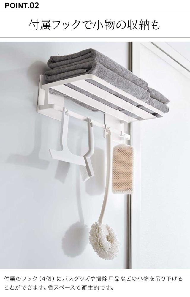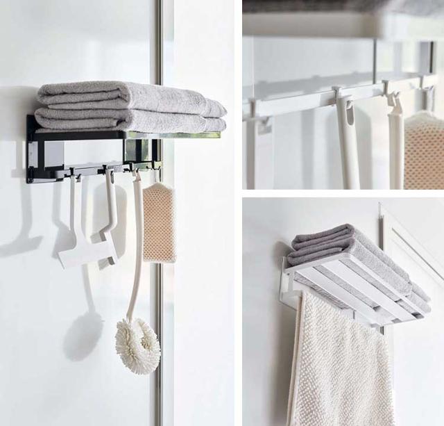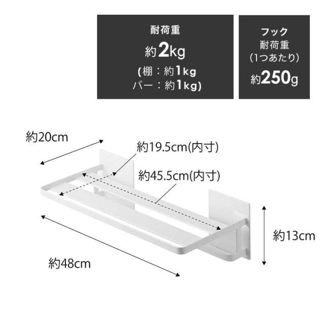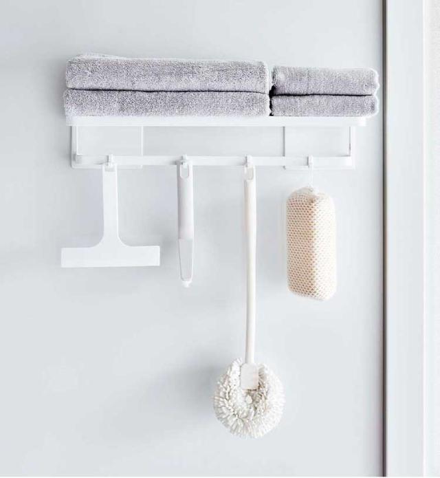 Details マグネットバスルームバスタオル棚 マグネットでお風呂の壁に取り付ければ、バスタオルが置ける棚を簡単に作ることができます。バスタオルとフェイスタオルが一緒における幅があり、ホテルのタオル置きのようにスッキリ。下のバーにバスマットをかけて干したり付属のフックでバス小物を吊り下げても便利です。冬場の寒い時期にもお風呂の外に出ずに身体を拭くことができて体が冷めません。 幅約45.5cmと幅広でバスタオルとフェイスタオルをセットで置くことができます。 お好みの位置に付属のフックを取り付けて小物の収納ができるので、お掃除グッズの一括収納に便利です。 ブランド名 tower / タワー 品番 8180/8181 サイズ 約H13×W48×D20cm 内寸 棚:約W45.5×D19.5cm バー:約W45.5×D4.7cm 取り付け可能な壁面 マグネットがつく平らな面・スチール壁面 ※ご使用の前に必ずご確認ください。あらかじめ、マグネットがつくことや、十分な保持力が得られることをご確認の上ご使用ください。浴室の壁の種類によってはご使用頂けない場合があります。 重量 約1400g 耐荷重 約2kg (棚:約1kg バー:約1kg フック1つあたり:約250g) ※衝撃をゼロとした場合の静止耐荷重です。 付属品 フック×4 素材 本体:スチール(ユニクロメッキ+粉体塗装) マグネット 滑り止め:シリコーン 生産国 中国 ご注意 ※表記サイズより、多少の誤差があることがございます。 ※商品の画像はできる限り実物に近づけるよう配慮しておりますが、お使いのモニターやご覧になる環境によりましてはカラーの見え方に差が出る場合がございます。ご了承くださいませ。 関連キーワード 省スペース ホワイト ブラック おしゃれ ホテルライク 高さ調整 耐荷重2kg ずれない スマート バスグッズ | |||||||