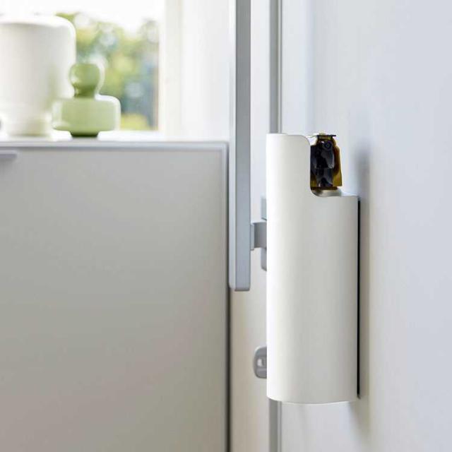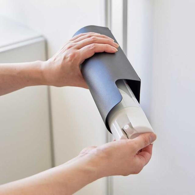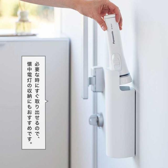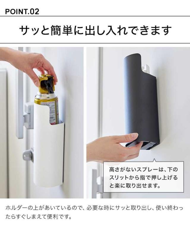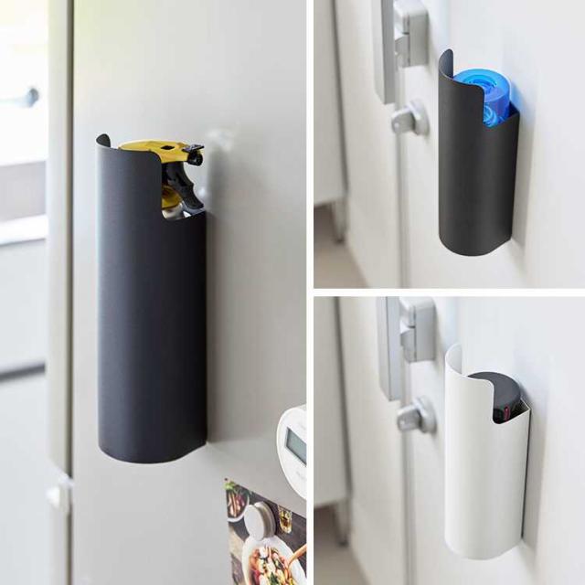 マグネットで玄関扉や冷蔵庫横、洗濯機横に簡単取り付け!生活感のあるスプレー類を隠して収納できるホルダーです。殺虫剤や消臭・防水スプレー、潤滑剤など様々な種類のスプレーを隠して収納。スプレーが取り出しにくい場合は下から指で押し上げると簡単に取り出すことができます。使いたい時にサッと取り出しやすいので懐中電灯の収納にもおすすめです。