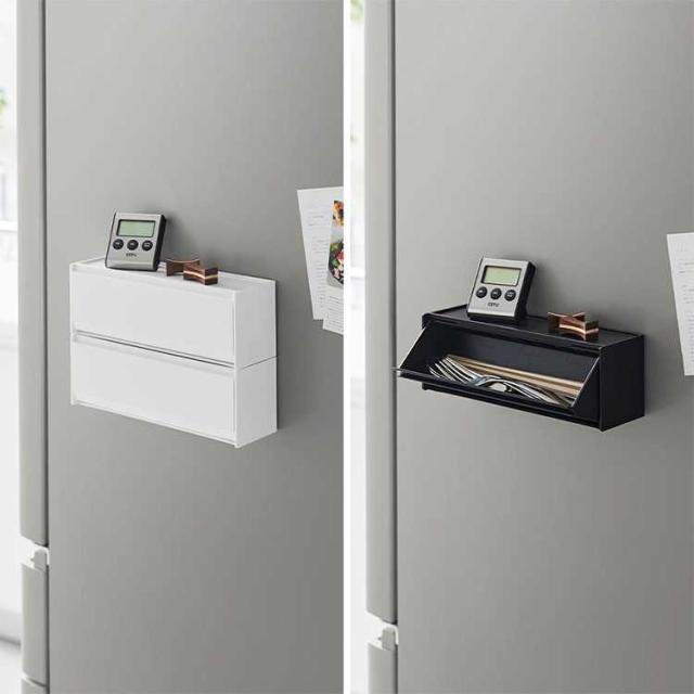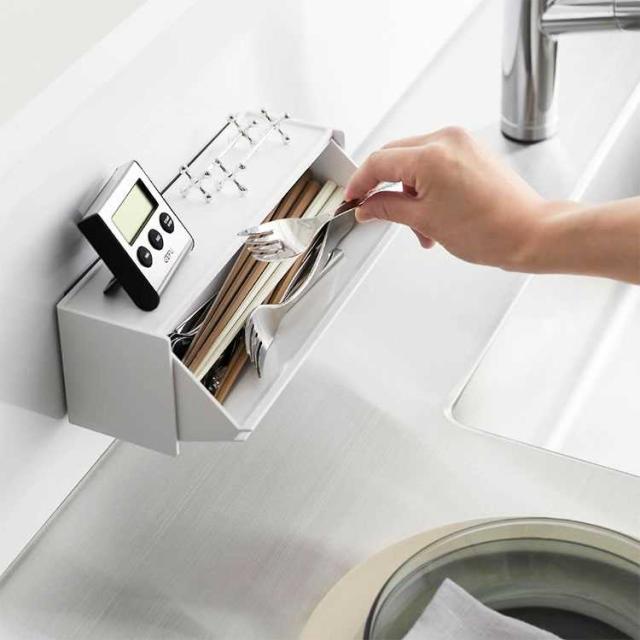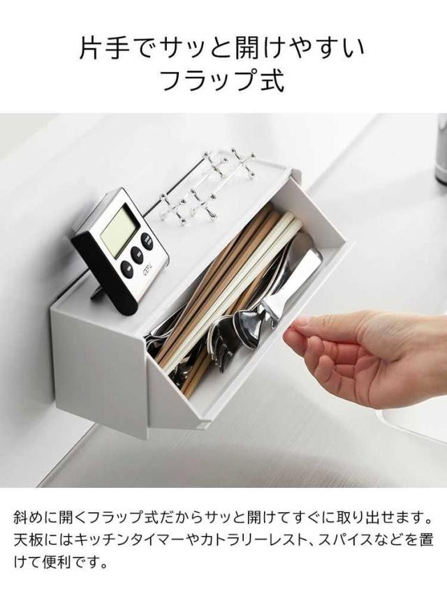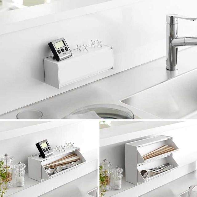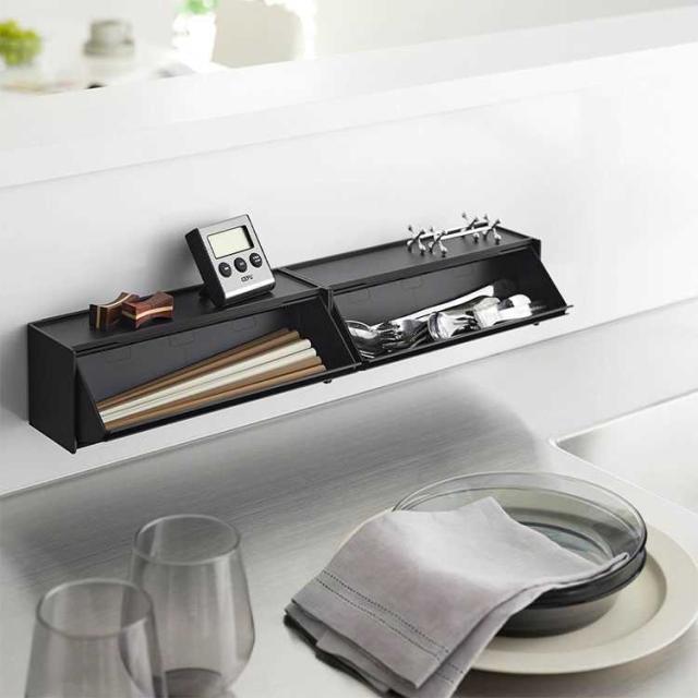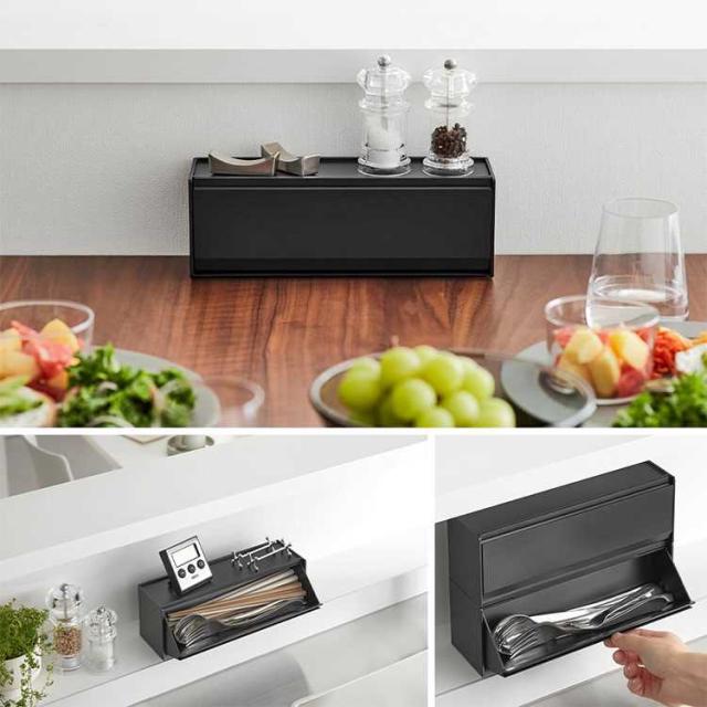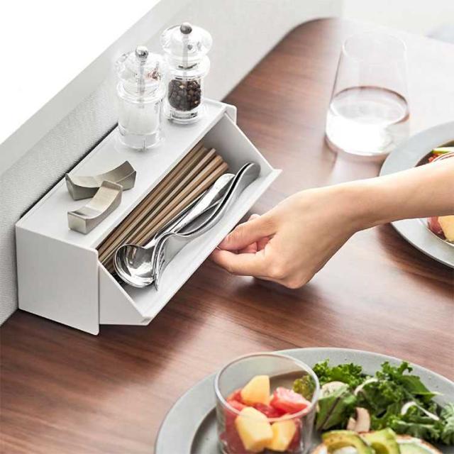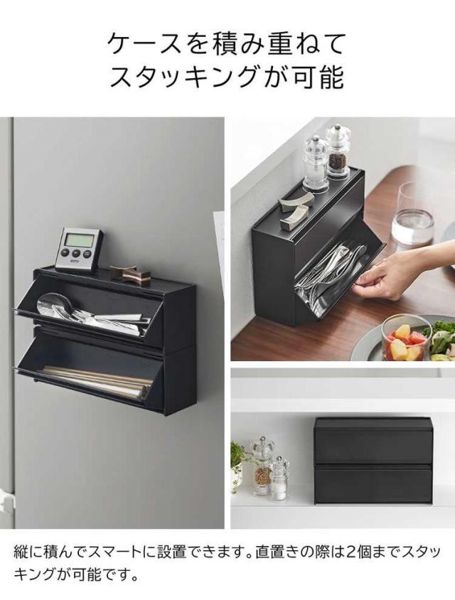 マグネットで壁に取り付けても置いても使える!カトラリーがサッと取り出しやすい便利なケースです。シンプルでスタイリッシュなデザインなので場所を選ばずスマートに設置でき、積み重ねても使用することができます。斜めに開口するフラップ式で片手で簡単にカトラリーを取り出すことができます。天板はトレーになっているので小物置きとしても便利。冷蔵庫横などにマグネットで設置したり、スパイスニッチやダイニングなどマグネットがつかない場所に置いても使用するこができるので便利です。