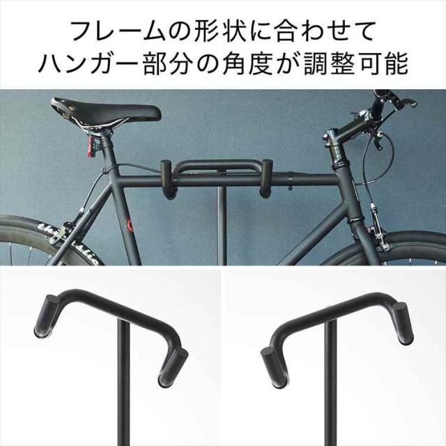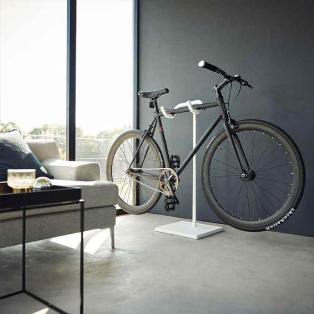 室内でスポーツ自転車をすっきり飾って収納できるスタンド。一本支柱のスリムな構造で、スポーツ自転車をスマートに浮かせてディスプレイすることができます。ハンガー部は自転車のフレーム形状によって角度を調節でき、フレームをキズつけないためにシリコーンの滑り止めが付いています。ハンガー部にはヘルメットを掛けておくことも。玄関やリビングで、ハンガーに掛けるだけで、お気に入りのスポーツ自転車を省スペースにディスプレイして収納できます。