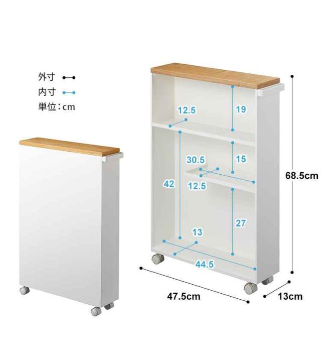 | サイズ | ■高さ68.5(キャスター含む)×幅13×奥行47.5cm 内寸 ■天板:幅13×奥行45cm ■上段:高さ19×幅12.5×奥行44.5cm ■中段:高さ15×幅12.5×奥行30.5cm ■下段:高さ27×幅12.5×奥行44.5cm ■中段〜下段:高さ42×幅12.5×奥行13cm ※表記サイズより、多少の誤差があることがございます。 |