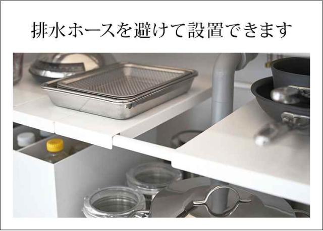設置場所に合わせて幅を調節でき、排水ホースを避けて棚板を配置できるので使い勝手は抜群です。
