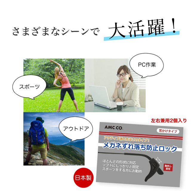 | 説明 | メガネのツルにかぶせるタイプのずれ落ち防止シリコンです。 日本製の特殊シリコン採用で、しっかりとずれ落ちを防ぎます。 スポーツ全般(運動 ランニング ウォーキングなど)のアクティブなシーンでのご使用にもおすすめです。 いつでも取り外し可能なアジャスターをセットしており、細身のツルのメガネにも対応しています。 男女兼用 |