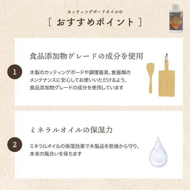 | 説明 | 食品添加物グレードの成分を使用しているので安心してご使用ください。 ミネラルオイルの保湿力で乾燥を防ぎます。 無香料でクセが無く、浸透力も抜群です。 無垢製品、塗装製品の両方ともご使用いただけます。 ムラ、シミを防ぐため、薄く均一にムラ無く塗り延ばしてください。 一気に大量に使わず、少量ずつご使用ください。 |