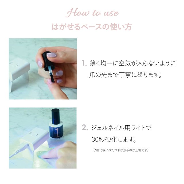| 使用上の注意 | 蛍光灯の光などでジェルが固まること恐れがあります。蓋を開けたままの放置・保存は避けて下さい。 直射日光の当たる場所、極端に高温または低温の場所では保管しないで下さい。 開封後は半年以内に使い切ることをおすすめしています |