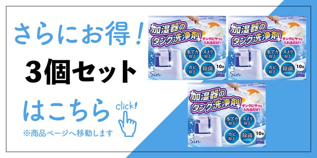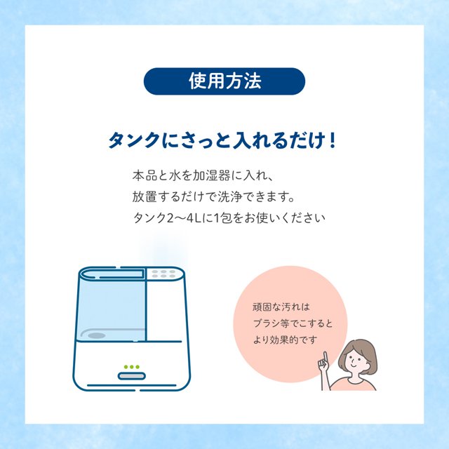 | 使用上の注意 | タンクにぬるま湯と本品を入れ、浸け置きし水洗いしてください。2〜4Lに1包が目安です。※タンクが取り外せないときは本品を投入したまま使用できます。 |