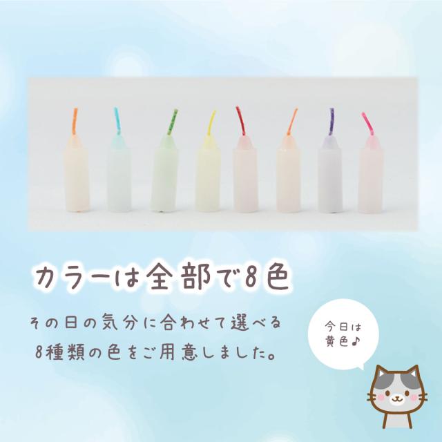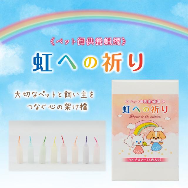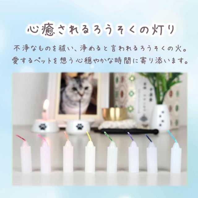8色のカラフルな蝋燭で、大好きなペットにお祈りを。かわいいミニろうそくです。色とりどりの蝋燭の優しい灯と共に、ペットに思いを馳せてください。