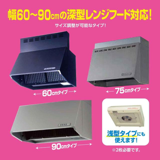 フィルターの幅は50〜89.5cmまで調節ができるので、60cm〜90cmタイプの深型レンジフードなら1枚で使用できます。浅型タイプにも付けられますが、その際はフィルターが2枚必要になりますのでご注意ください。