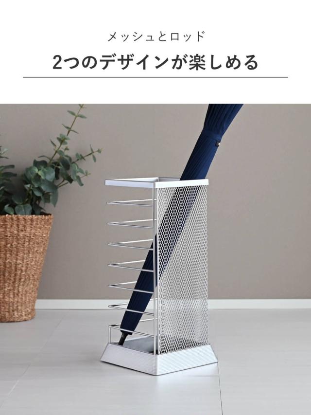 片面はメッシュ、もう片面はロッドと2つの違ったデザインを楽しめる傘立てです。濡れた傘も乾きやすい通気性の良い構造なので、清潔感を維持できます。角型なのでコーナーに置くとすっきり収まり、どんな玄関にも馴染みます。