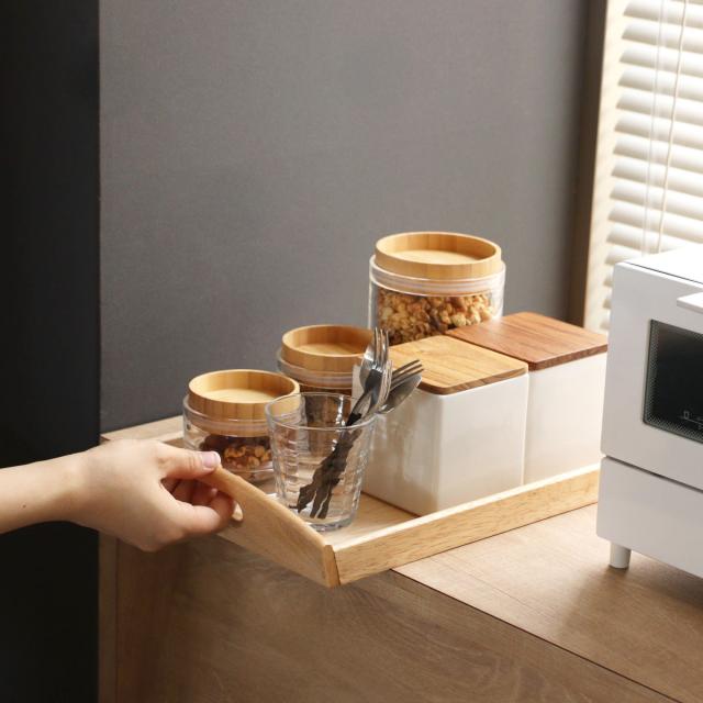 持ち手部分は引き出しやすく、棚などの引き出しトレーとしても便利です。キャニスター、食品のストック、コーヒー豆などをトレーにまとめて収納できます。
