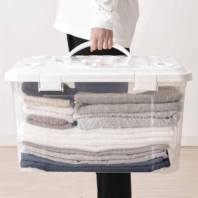 衣類の収納や日用雑貨の整理、アウトドア、レジャーにと、色々な用途で使える収納ボックスです。ハンドル付きなので、押入れやクローゼットから取り出す時や別の部屋で使いたい時、屋外に持ち出す時などに便利です。ハンドルはフタのくぼみに納まります。