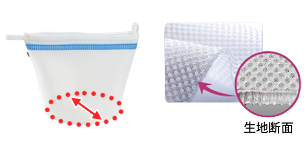 | 容量の入る底マチ 平らな形状のネットよりもたくさん入る底マチ付きなので、一回の洗濯でたくさんのおしゃれ着を洗濯することができます。 | 衣類を優しく洗う 底マチ部分にクッションメッシュ生地を使用しているので、ブラウス・下着などのデリケートなおしゃれ着の絡まりを防いでやさしく洗えます。 | |