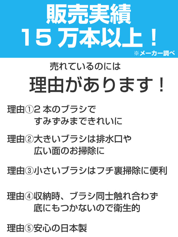 おすすめポイント 小さいブラシはトイレ掃除の大きな戦力になります小さいブラシは普段届かないフチ裏の汚れをごっそり取ってくれます。フチ裏をきれいにすることで、トイレの嫌な臭いも軽減されます。 小さいブラシはシャワーノズル等の細かい部分にも小さいブラシはフチ裏はもちろん、シャワーノズル部分のお掃除にもお使い頂けます。 大きいブラシは排水口や広い面のお掃除に大きいブラシは排水口等の広い面のお掃除におすすめです。 収納時はブラシ同士が触れ合わず、底にもつかず衛生的2本とも1つのケースに収納できます。また出し入れしやすい形状なので、使いたい時にさっとお使い頂けます。 ブラシ(大)は替えブラシ(別売)があります大きいブラシには替えのブラシ(別売)がございます。 |