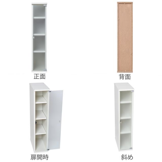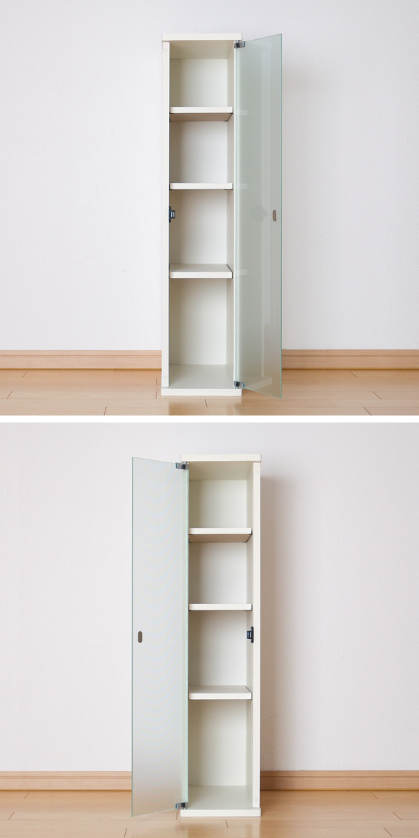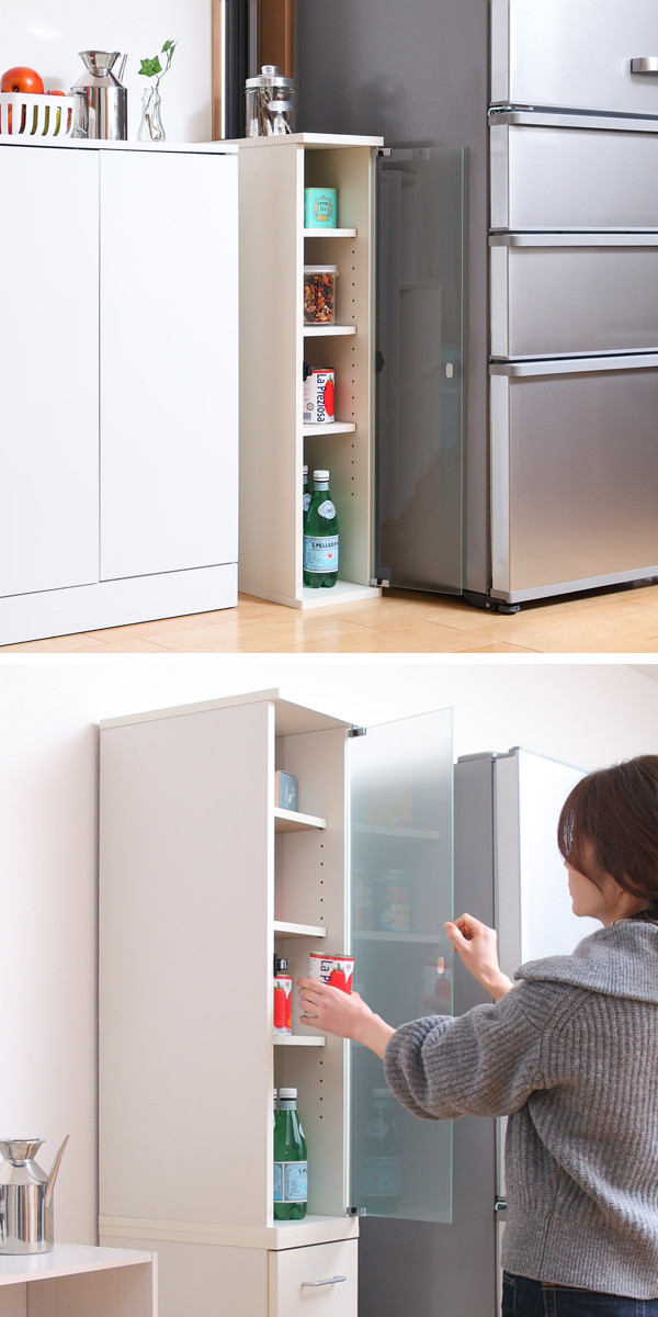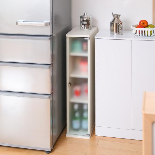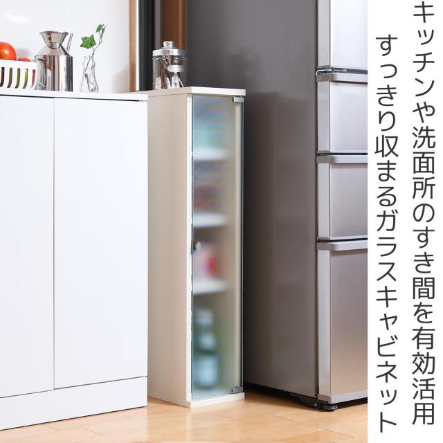 キッチンや洗面所、トイレのすき間を有効活用できるガラス扉キャビネット幅20cmです。お部屋に合わせやすいシンプルなデザインです。扉は中身がぼんやり見えるミストガラスのなので生活感を軽減させてくれます。